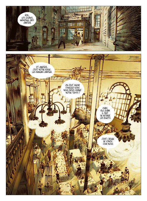 David François dépeint le Paris d’un siècle où les calèches roulent sur le pavé, où le métro s’appelait encore le métropolitain et où les putes des maisons closes côtoyaient flics et voyous. Avec un encrage effet crayons et des couleurs d’une dominante jaune-beige lorgnant vers le sépia, réalisées par François avec la complicité de David Périmony, le voyage dans le temps fonctionne à merveille.
