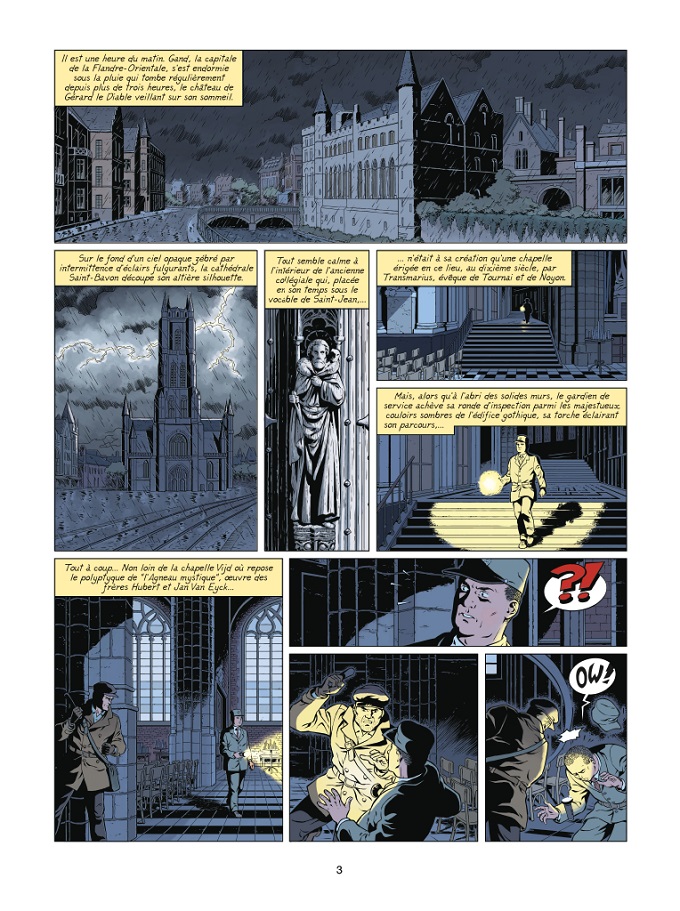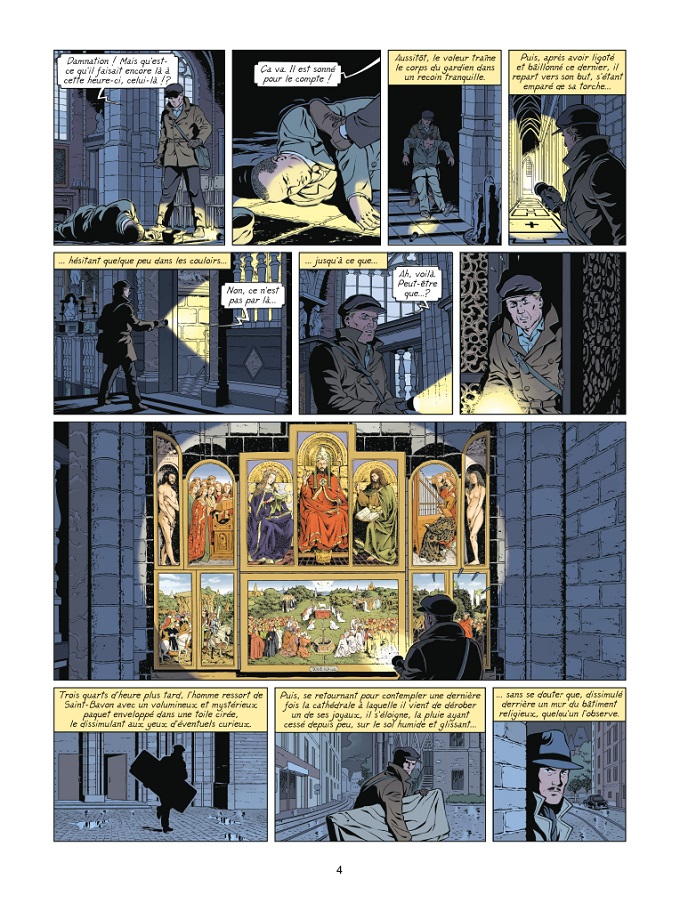 Lefranc va se retrouver embarqué bien malgré lui dans le milieu de l’art et des faussaires. De plus, pourquoi voler des tableaux alors que ceux-ci sont des copies des originaux disparus ? Voici donc notre reporter embarqué dans une nouvelle aventure qui va le mener de Gand à Venise en passant par Paris. Va-t-il réussir à retrouver le panneau dérobé à Gand en 1934 ?