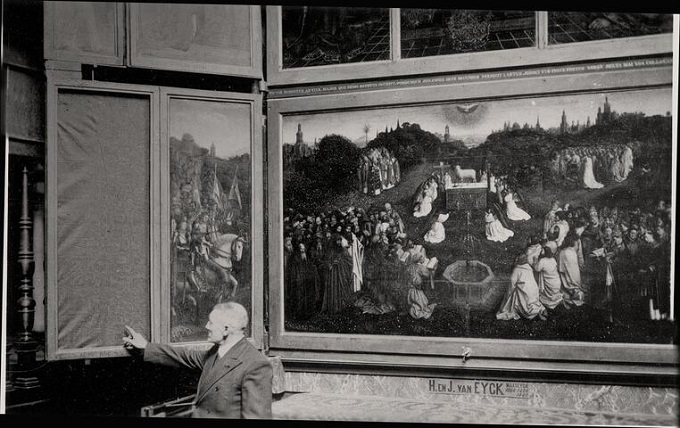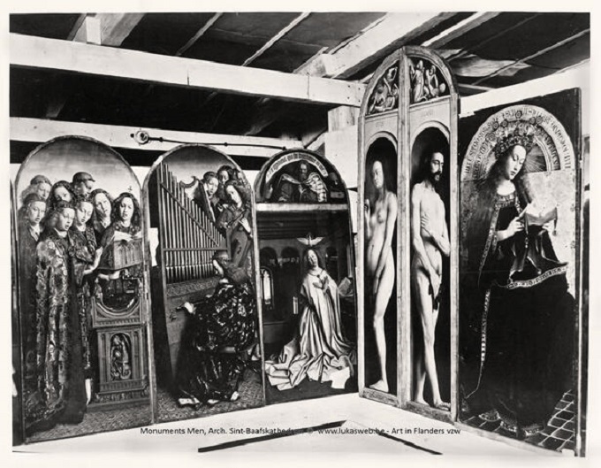 1945 Découverte par l'armée américaine (Monuments Men) des panneaux de l'Agneau mystique entreposés dans une mine de sel située en Autriche