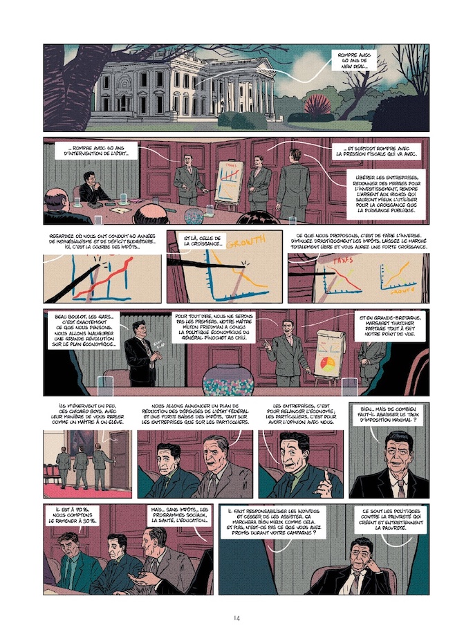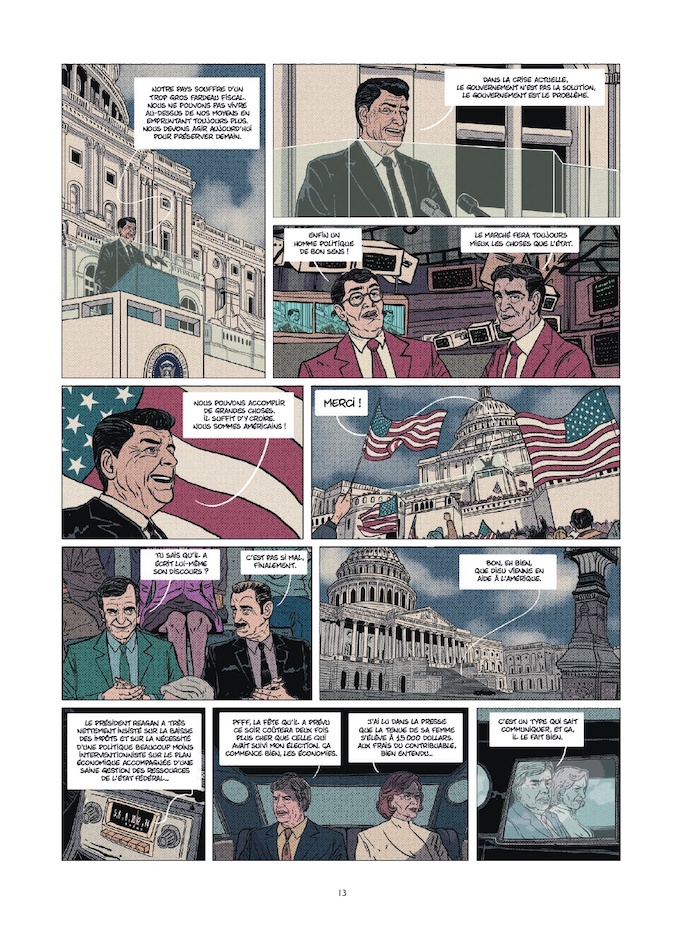 Ceci dit, sans les développer excessivement, Jean-Yves Le Naour s'arrête aussi sur des mesures économiques phares des années de reaganisme. Favorisant un libéralisme dur et une politique du laissez-faire, il renforça la valeur du dollar face aux monnaies étrangères, opta pour la diminution des impôts pour les plus riches, le retrait des aides fédérales aux plus pauvres, une attitude climatosceptique, ... car
