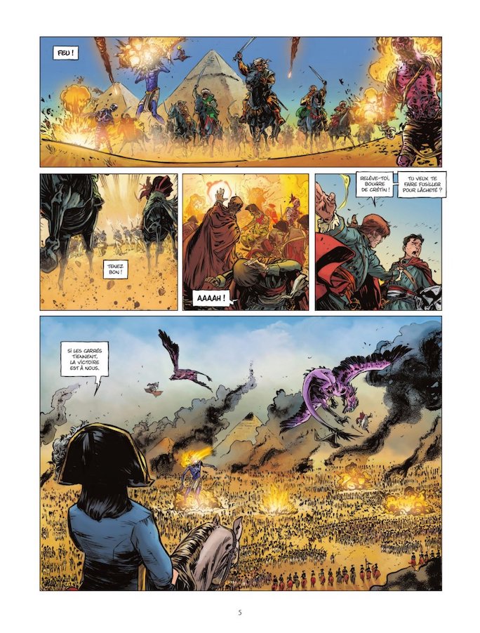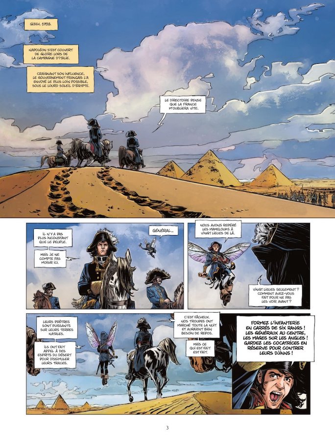 Un savant mélange de fantasy dans un récit historique offrant de larges possibilités de développement. Une uchronie installée dès la première page de l'album. Il est vrai que mêler Napoléon, sa campagne d'Égypte, le mystère de ses pyramides et y ajouter quelques créatures classiques des légendes locales ou européennes offre un cocktail détonnant ! C'est ainsi que momies zombies, vampires, sorcières, vodianoï et surtout la grande Baba Yaga viennent s'insérer tout naturellement dans la grande Histoire pour la dynamiter.
