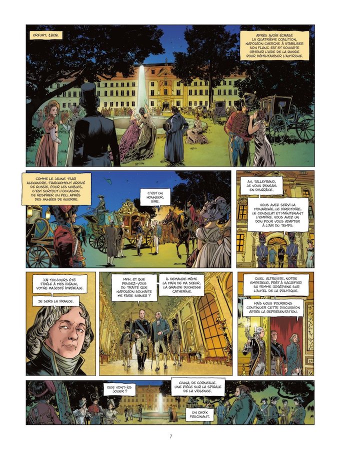 10 ans plus tard, lors de la conférence d'Erfurt, l'Empereur tente de convaincre le jeune Tsar Alexandre de signer une alliance bilatérale. Lui, en plus d'épouser la sœur du tsar et de lui abandonner les provinces danubiennes, n'interviendrait pas en Pologne, pays lorgné par la Russie. En échange, le tsar inciterait la Grande-Bretagne à une paix durable avec la France et à soutenir son ancien ennemi en cas d'attaque de l'Autriche !