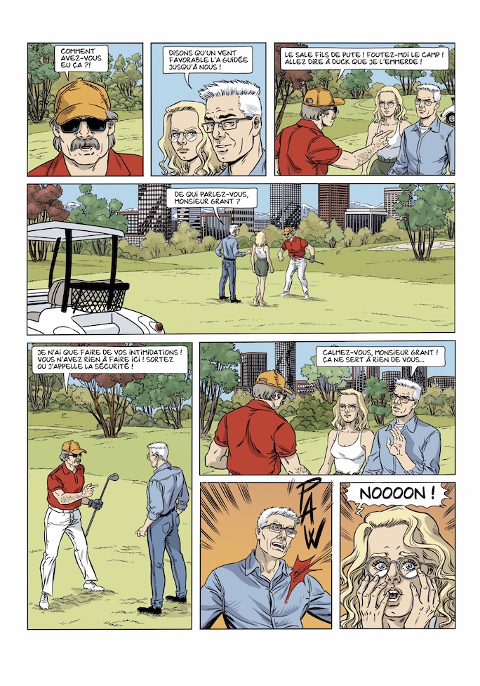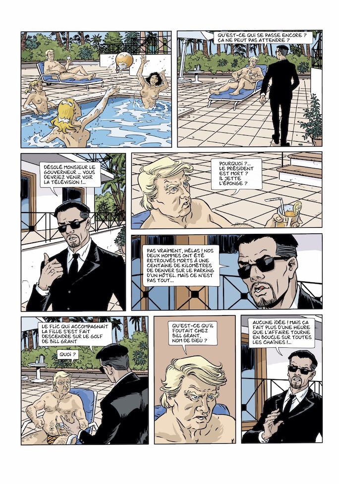 Néanmoins, en y ajoutant une touche d'ironie ou de parodie satirique. Pour exemple et comme nous l'avions découvert au tome 1, l'un des protagonistes n'est pas "anodin". Duck nous fait largement penser, visuellement, à un certain Donald ... Mais évidemment, toute ressemblance avec quelqu'un de réel ne serait que pure coïncidence ! D'accord, il lui ressemble, chevelure blonde, embonpoint avancé, entourage féminin "léger", port de casquettes rouges "America", ...