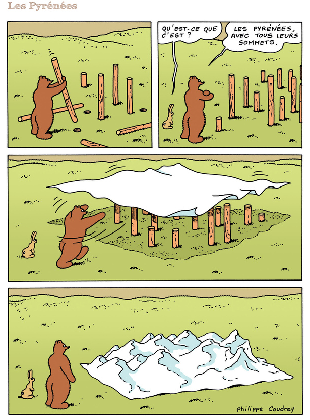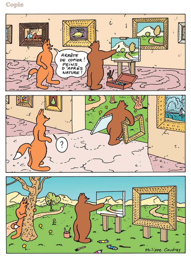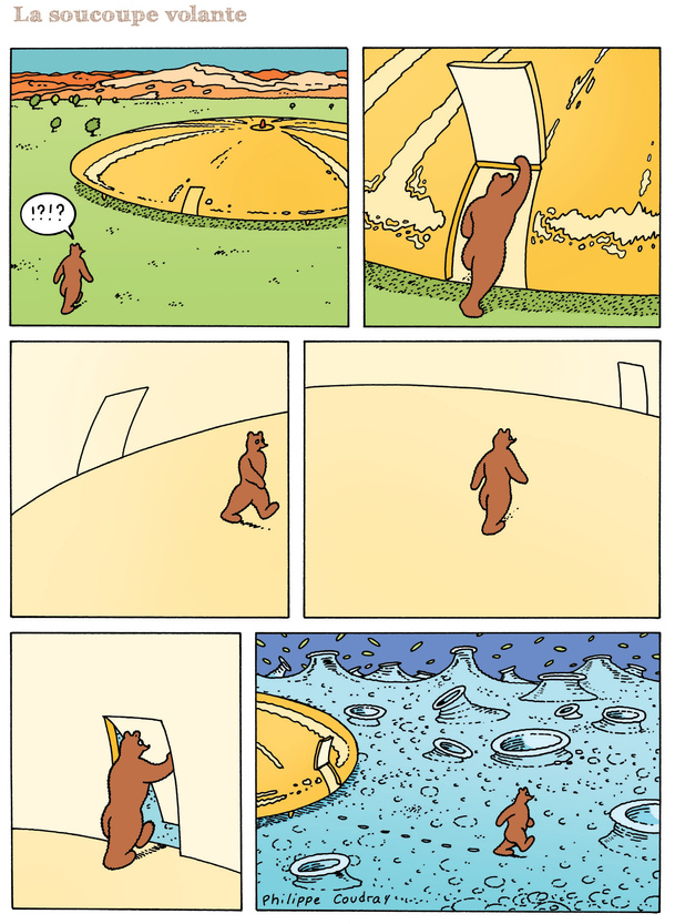 Le graphisme de Philippe Coudray est d’une simplicité universelle. On pourrait penser qu’il s’adresse uniquement aux plus petits, mais c’est un leurre. C’est simplement une stratégie (s’il y en a une) pour être compris du premier coup d’œil par tous. Ce n’est pas pour rien qu’il est traduit en anglais, en allemand, en japonais et en mandarin.