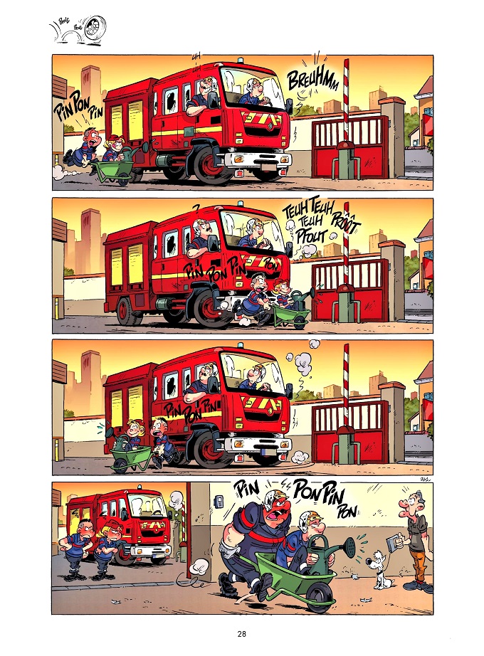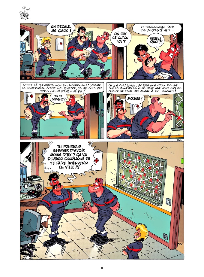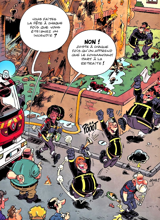 On l’a déjà dit dans ces colonnes : Bamboo s’est engouffré dans la zone laissée presque en friche par Dupuis. Ils profitent ainsi de ce qui a fait le succès de la maison de Marcinelle : l’humour Gros Nez. Avec Christophe Cazenove, ils tiennent leur Raoul Cauvin. Les pompiers font ainsi figure de porte-étendard du genre, avec les gendarmes et les profs.