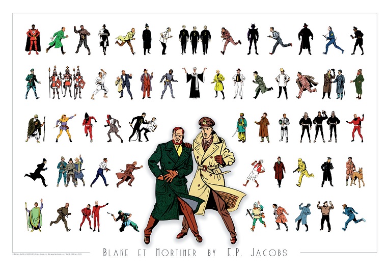 C’est cette formidable richesse créative que la société Gomb-R Editions a voulu mettre en avant en réalisant, sous licence Dargaud, une superbe affche inédite sur Blake et Mortimer reprenant 70 personnages dessinés par Jacobs du Secret de l’Espadon - Tome 1 au 3 Formules du Professeur Sato - Tome 1, et détourés pour l’occasion, dans une somptueuse présentation, sur papier Velin Rives 250 gr, au tirage très limité.