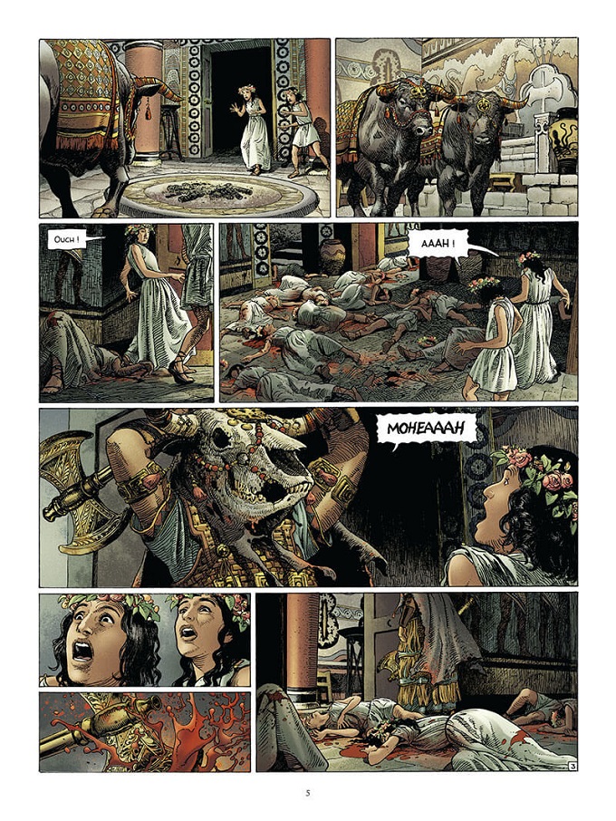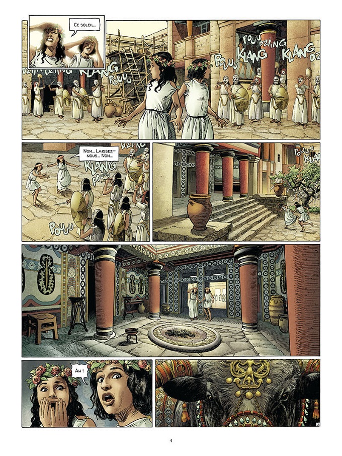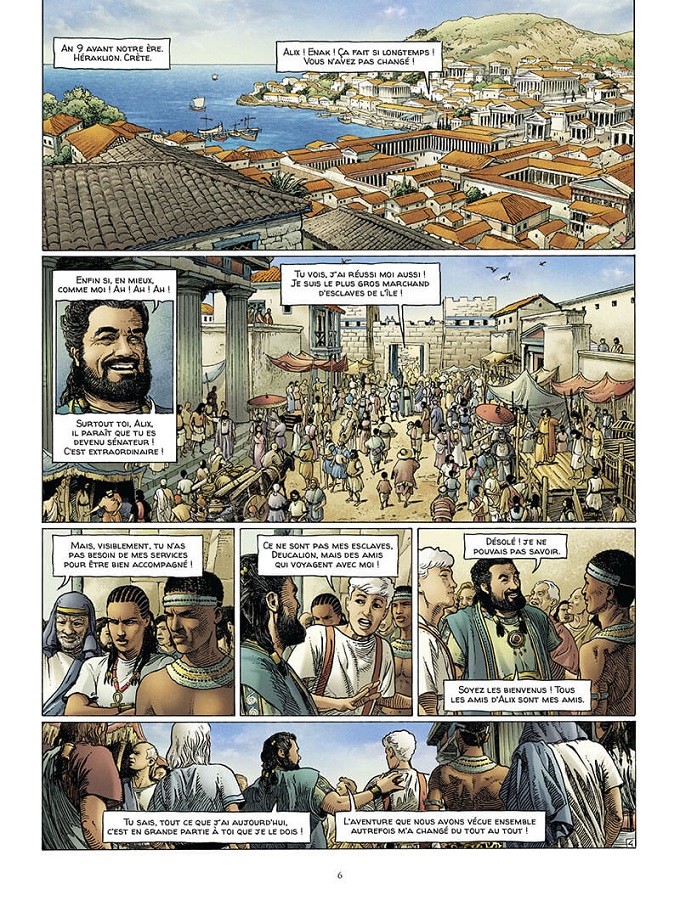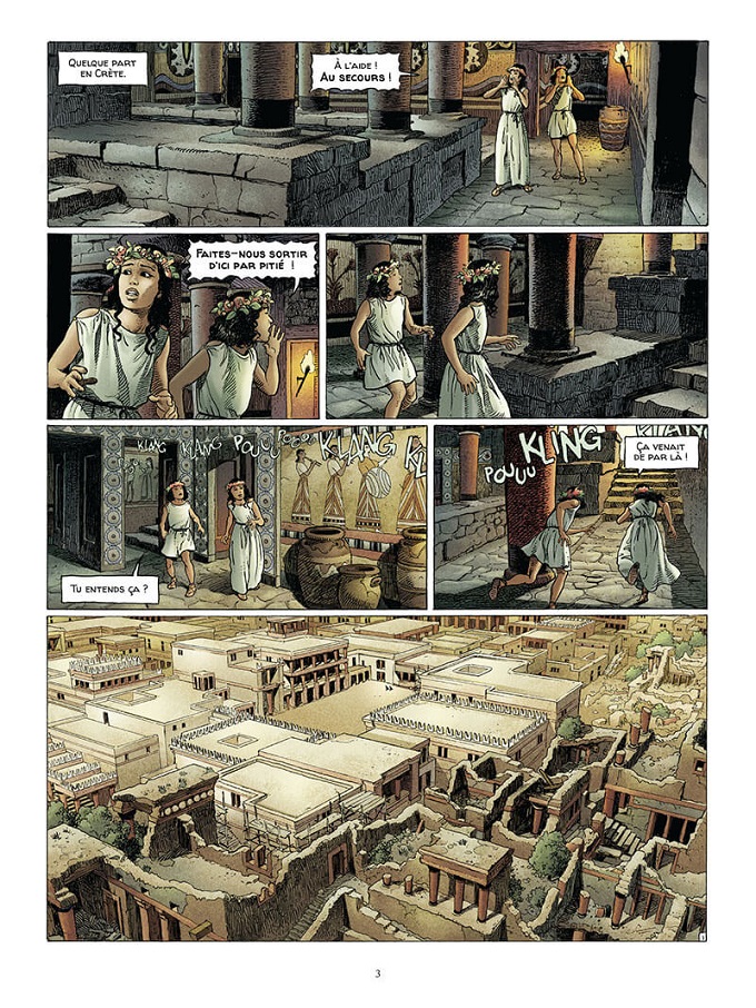 Toujours à la recherche de reliques en suivant les indications du disque d’Osiris, Alix débarque sur l’île, à Héraklion, non pas pour philosopher mais pour y retrouver Deucalion. Lui aussi a bien changé en trente ans. Devenu un riche marchand d’esclaves, il s’est fait construire une superbe demeure, ou plutôt un palais digne d’un dieu dans les ruines du labyrinthe du Minotaure !