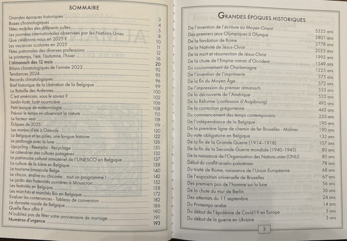 Et si cela ne suffisait pas, les journées internationales, les fêtes régionales, patronales, religieuses, ... ou encore les jours et lieux de marchés hebdomadaires, des tableaux de contenance et de conversion de poids et mesures, des informations sur la Belgique, notre dynastie, ... ou les horoscopes chinois, ...
