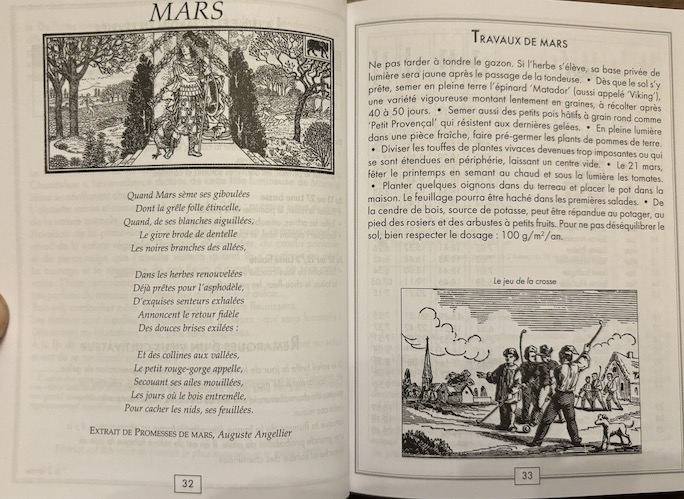 Chaque mois est détaillé en travaux à réaliser, en phénomènes naturels à observer, les horaires solaires et lunaires, les pleines lunes, les marées, ... et évidemment le calendrier des saints/saintes !