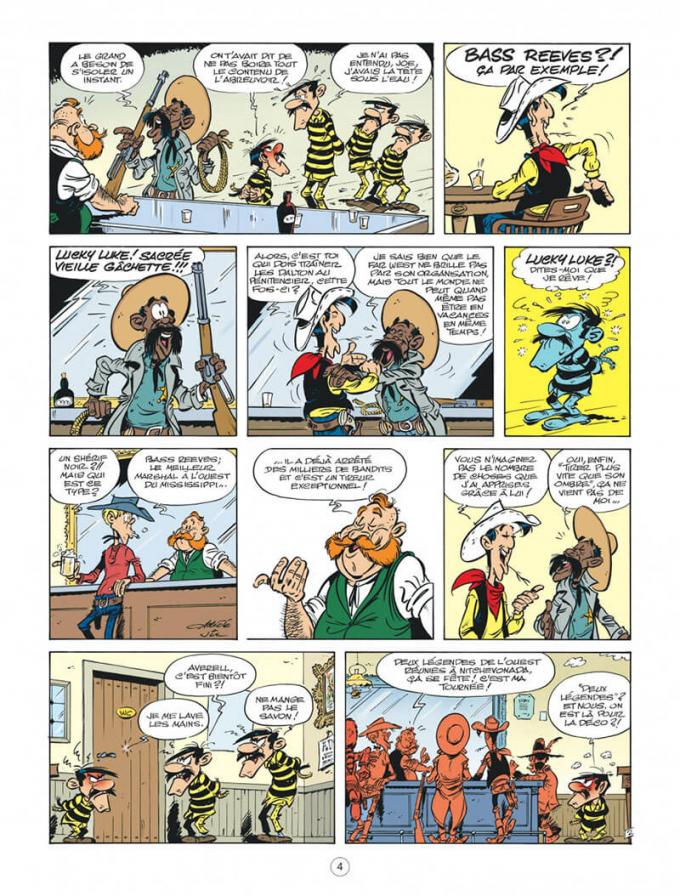 Comme l’a fait souvent Goscinny, le scénariste intègre un personnage réel en la personne du premier marshall adjoint noir nommé en 1875 : Bass Reeves. Il fut un mythique héros justicier de l’Ouest. On croisera aussi furtivement deux gamins que connaît bien Mark Twain.