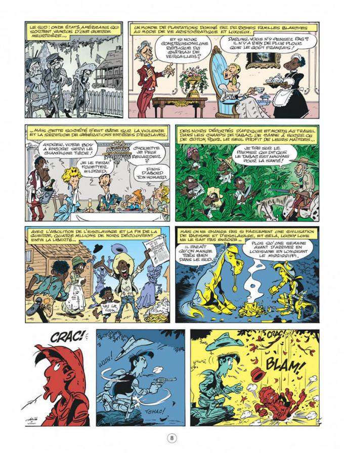 Jul aborde le sujet de l’esclavage, bien longtemps après que Raoul Cauvin et Willy Lambil ne l’aient fait avec Black Face. Le traitement en est cependant fort différent. Les esclaves ont tout de suite confiance en Lucky Luke qu’ils accueillent comme le sauveur. Les racistes et le Ku-Klux-Klan sont les ennemis qui avancent démasqués… ou presque. On voit le chemin parcouru depuis cette époque. Bien que la route soit encore longue à faire, non seulement en Amérique, mais aussi dans le monde, Jul apporte sa pierre pour faire évoluer les mentalités dans le bon sens. Le scénario est dense, presque à l’étroit dans le carcan des quarante-quatre planches, mais c’est la loi de la série et ça a au moins le mérite d’éviter des longueurs.
