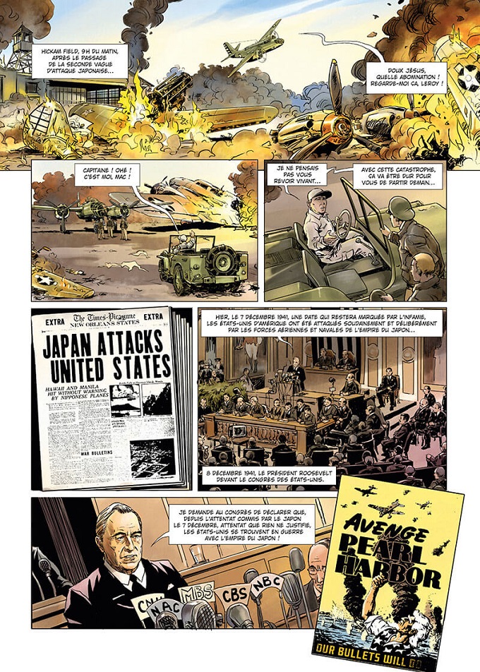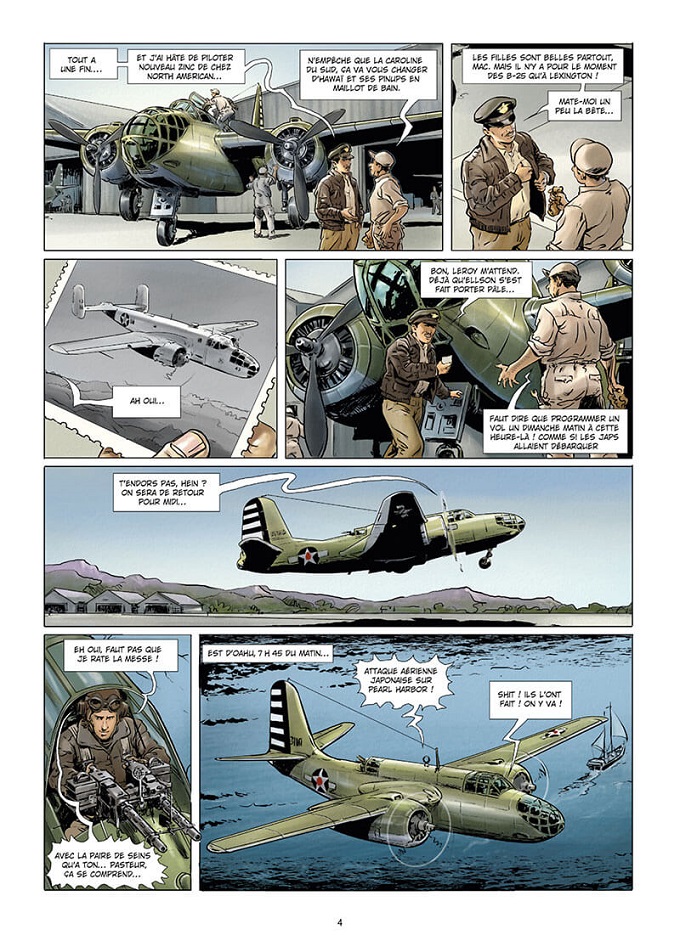 Après le Stuka et le Polikarpov, le troisième album de cette série éditée chez Soleil et consacrée aux « Warbirds » nous fait découvrir le bombardier B-25 Mitchel, utilisé par les Américains en représailles à l’attaque de la base de Pearl Harbor. La série a été scénarisée par Nolane, les trois tomes dessinés par des dessinateurs différents. Le dernier tome est illustré par Vladimir Aleksic qui nous délivre des dessins au plus proche de la réalité vécue à l'époque par les différents protagonistes. Le scénariste introduit l’histoire en reprenant l’attaque de Pearl Harbor pour expliquer la motivation des Américains afin d’aller rendre la politesse à l’empire du soleil levant. La couverture est illustrée par Maza, connu pour être le dessinateur de la série « Wunderwaffen » disponible chez le même éditeur.