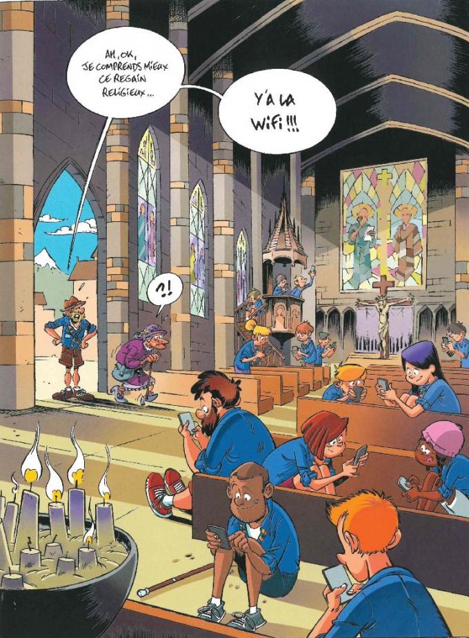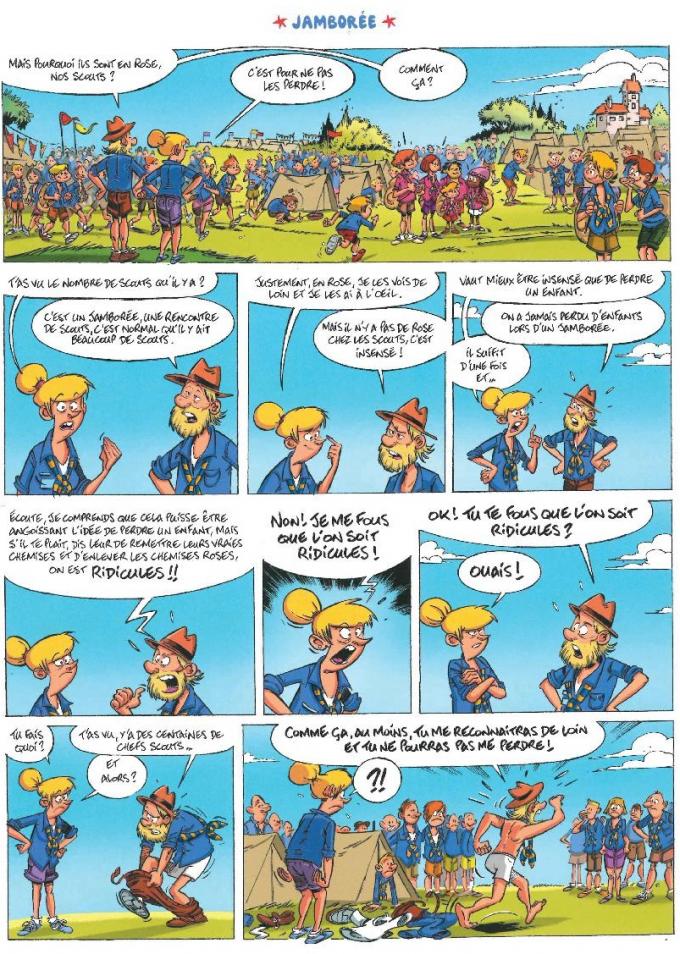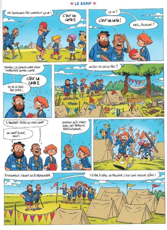 Cédric Ghorbani réalise un coup double en cette rentrée en débutant deux séries de gags : Enfin l’école ! chez Bamboo, et Les scouts, chez Michel Lafon. Egalement dessinateur de l’adaptation de Comme des bêtes chez Dupuis, l’auteur a ici un graphisme cousin de celui de Stedo, dessinateur des pompiers. Un peu plus de densité dans certaines cases et on pourrait presque confondre leurs styles.