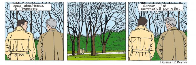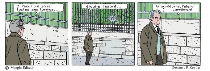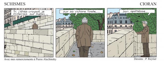 Dans une ligne claire à la Floc’h, Patrice Reytier s’empare des maximes efficaces et abruptes de Cioran. Sous forme de strips, il les met en scène dans la bouche de l’auteur arpentant les rues de la capitale. C’est si précis et méticuleux qu’on a l’impression que ces phrases étaient conçues pour ce mode d’expression. On ira ainsi du Père Lachaise au jardin des Tuileries, de la place de la Concorde aux quais de Seine. Dans une carte postale parisienne, les considérations métaphysiques et théologiques amènent à la réflexion sur le sens de la vie, ou, pour Cioran, son non-sens.