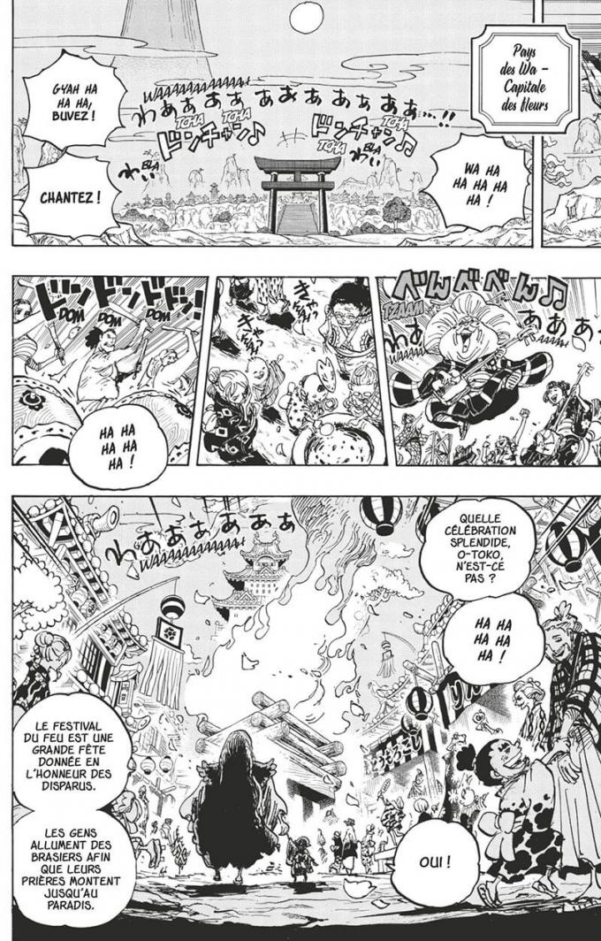 Pays des Wa. Alors que la bataille fait rage à tous les étages du dôme dans lequel est refugié l’empereur Kaïdo. Des milliers de soldats sont présents. Entre sabres et virus, toutes les armes sont permises. L’équipage de Chapeau de paille a trouvé en Yamato, la fille de Kaido, une alliée de poids. Leur union sera-t-elle assez forte face à Kaido aux cent bêtes ? L’impératrice Big Mom est elle aussi de la partie. La bataille d’Onigashima est loin d’être terminée. Comme on dit, tant qu’il y a de la vie,...