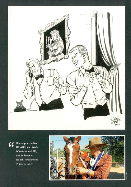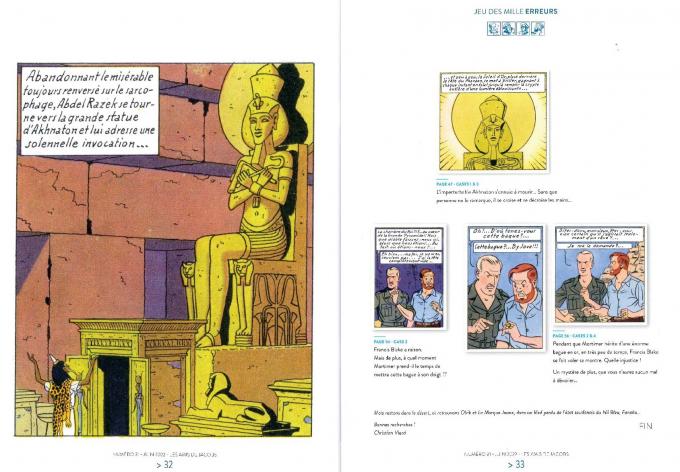 Christian Viard prend ensuite la main pour deux articles passionnants. On y apprend qu’il y a eu des suppressions et des créations de vignettes et des modifications de textes entre la version du Manuscrit du Manéthon, première partie du Mystère de la Grande Pyramide, parue dans le journal Tintin en 1952 et celle de l’album en 1954. Deux versions de deux planches sont mises en vis-à-vis. On s’attarde ensuite sur des vignettes du second tome de cette même Pyramide, relevant erreurs et curiosités. Guido Vogliotti aborde ensuite une caractéristique particulière de la BD franco-belge. Il montre comment, de Tibet à Hergé en passant évidemment par Jacobs, les plus grands auteurs ont fait marcher leurs personnages sur le plancher de leurs cases. Pour clore ce numéro, Jean Fontaine raconte la vie de Jean Meuwissen, fondateur du journal Bravo, qui permit à Jacobs, par le truchement de Jacques Laudy, de passer des planches des scènes de l’opéra à celles de son bureau à dessin.