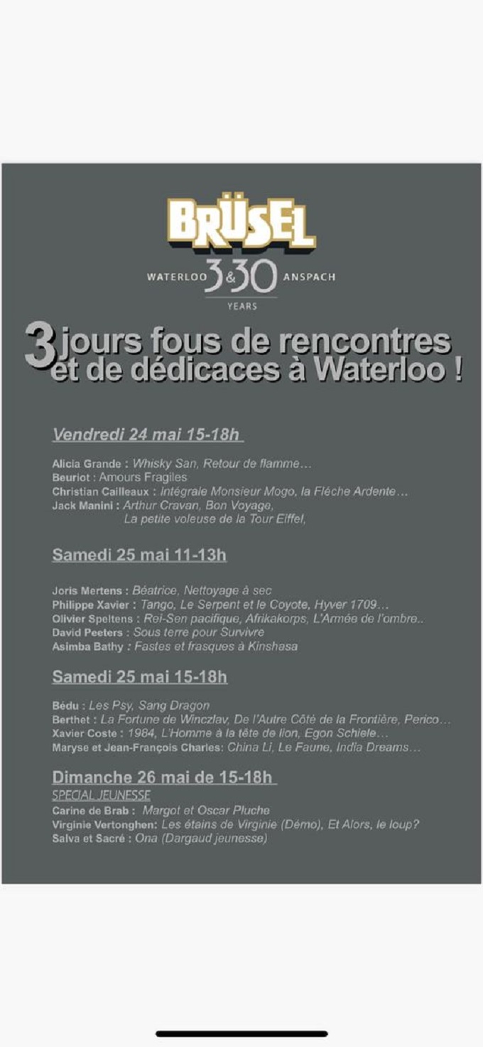 Les librairies Brüsel Waterloo & Anspach comptent respectivement 3 & 30 années au compteur. À l’occasion de ces anniversaires, le libraire organise du 24 au 26 mai plusieurs séances de dédicaces à l’intérieur de ses murs Waterlootois .