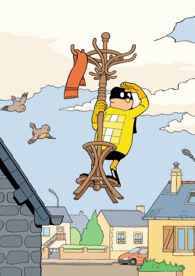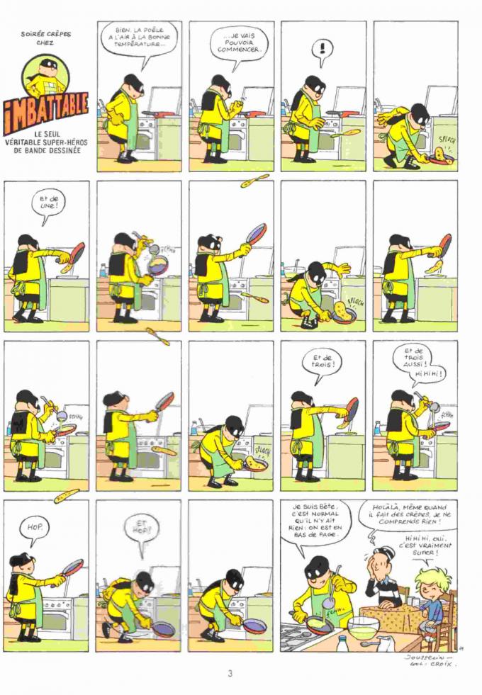 Qu’il pourchasse des bandits ou qu’il lance des crêpes, qu’il prenne le thé au clair de lune avec Jean-Pierre ou en terrasse avec Toudi, Imbattable est un super-héros et Jousselin est un poète de la case.