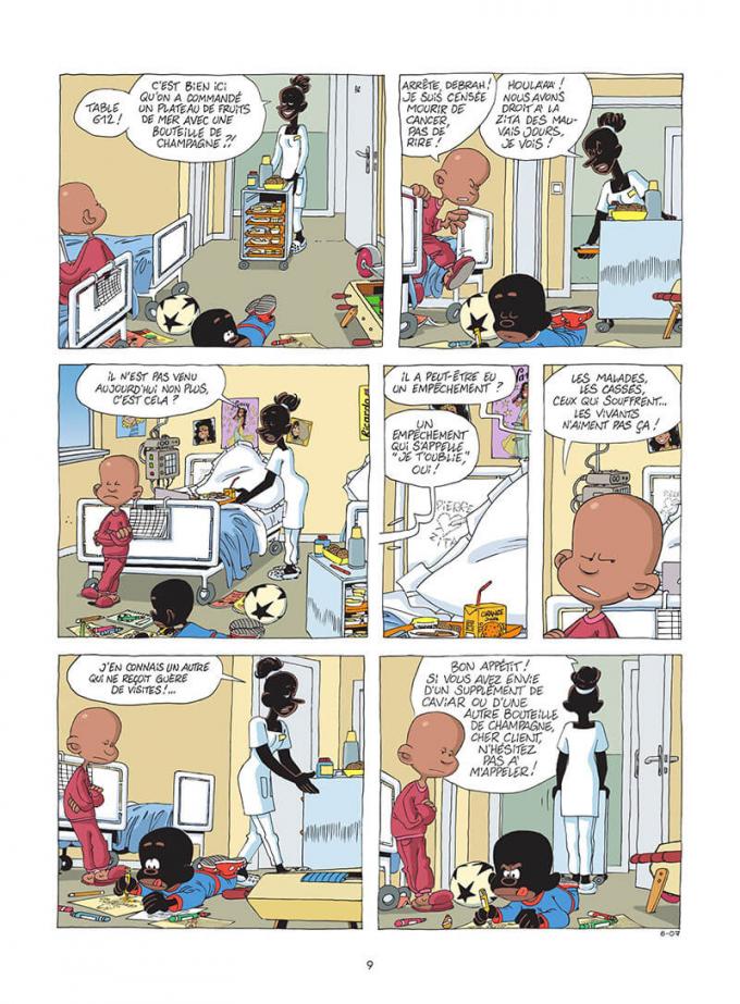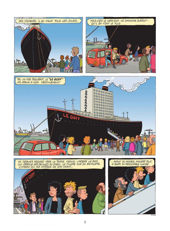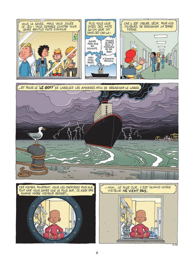 Zidrou démarre son histoire par une introduction atypique qui verra son écho dans la conclusion de l’album. Une famille va rendre visite à un enfant hospitalisé sur un bateau, véritable hôpital marin. Il montre l’importance, la nécessité et la vitalité des rendez-vous familiaux pour les malades, qui soignent les âmes, aussi bien de ceux qui sont alités que des autres.