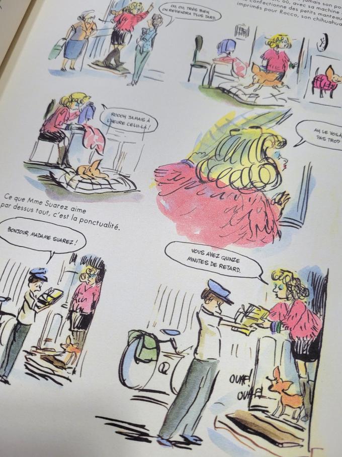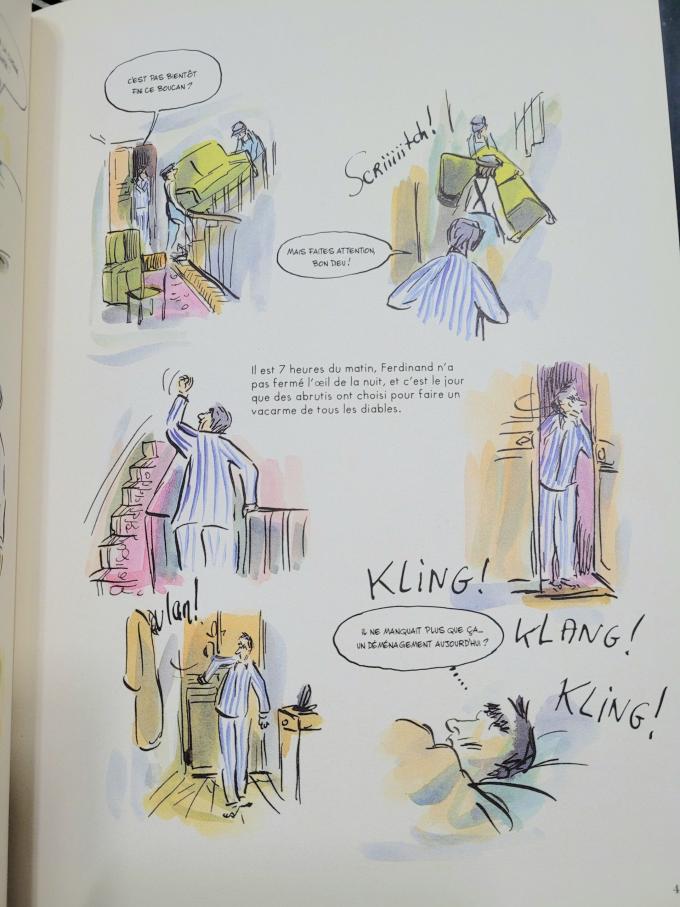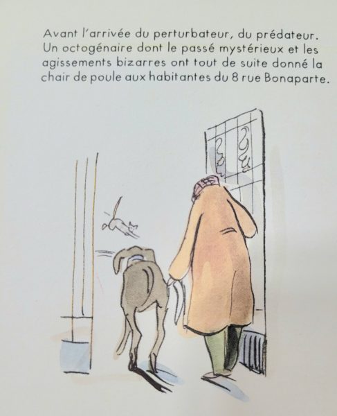 Véronique Grisseaux s’empare du roman originel pour l’adapter en bande dessinée. La transformation est trop saccadée en mini-chapitres, chacun ayant pour titre une expression populaire : Avoir une dent contre quelqu’un, C’est le bouquet !, Jeux de mains, jeux de vilains,… Après un début un peu poussif, ne sachant pas trop sur quel pied danser entre des cases (sans bords) dialoguées et de nombreux encarts narratifs, on se laisse peu à peu prendre par les relations entre les personnages et l’émotion suscitée par la rencontre entre Ferdinand et la petite Juliette. Au départ, on ne trouve pas trop d’intérêt ou d’objectif à la vie dans cette résidence. Puis, en apprenant à connaître les résidents, on en fait comme par magie ses propres voisins. On écoute aux portes et on regarde par les judas. C’est là que la magie Valognes opère. Son histoire fait du lecteur un habitant discret du 8 rue Bonaparte. Aux dessins et aux couleurs, Christine Davenier signe son premier album. Les images se succèdent et s’enchaînent comme des journées de vie dans un graphisme aquarellé. Il y a une simplicité à la Sempé, mais sans vraiment y ressembler, chez Davenier.