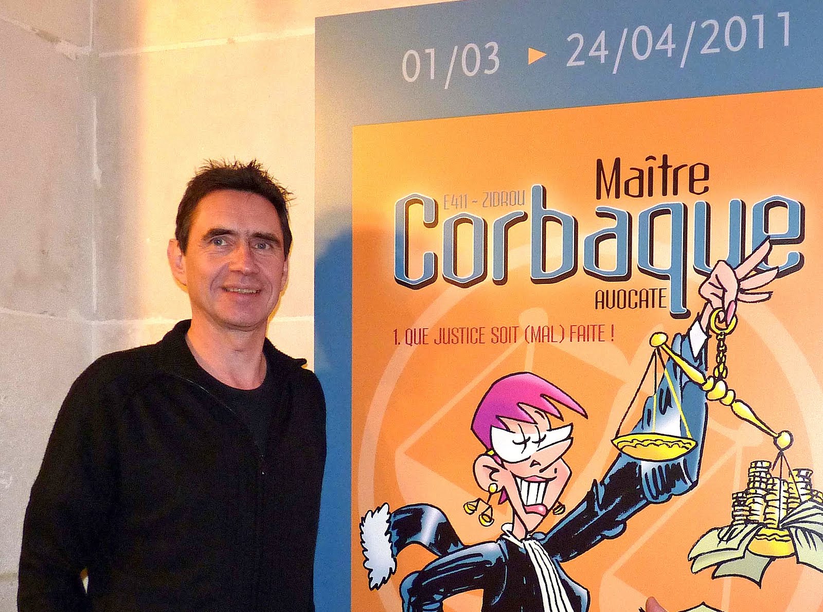Zidrou le scénariste et E411 le dessinateur avaient donc créé cette série qui était une caricature du processus de l’époque, même si ce processus est une caricature de la justice. Donc, ils ont créé cette série, Me Corbaque, qui est une avocate qui pousse ses clients à faire les procès les plus absurdes possibles afin de gagner le plus d’argent possible, à condition qu’on lui verse la moitié des sommes des dommages et intérêts récoltés.