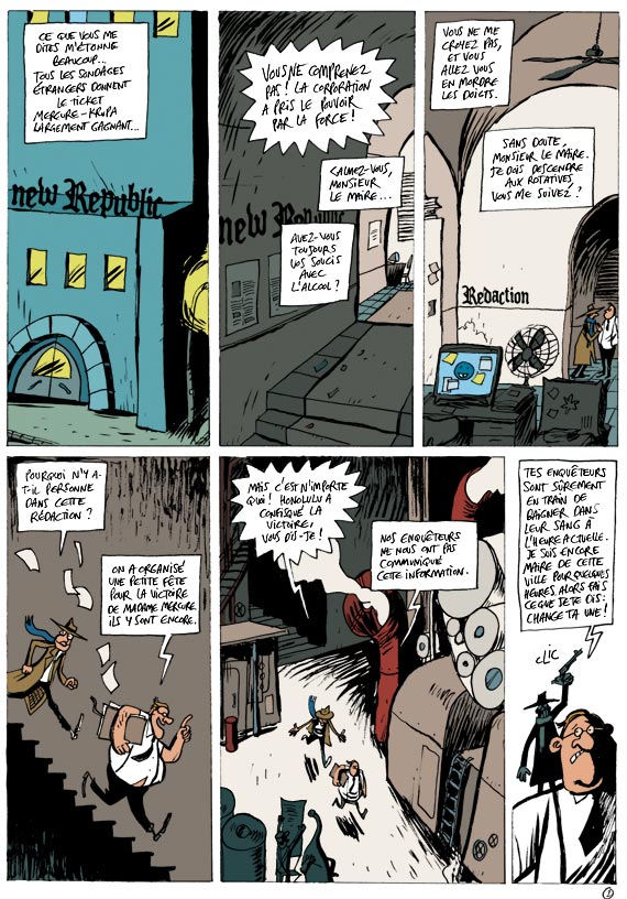 Captain America, Hervé Bourhis dynamite lui aussi à tout va. Il rend hommage à la culture pop tout en mettant à nu le mécanisme du pouvoir. Il jette un cachet d'aspirine dans le bouillon des aventures de super héros. Le résultat est un triptyque effervescent, détonnant et déconnant. En tout cas, c'est comaque et comique, un dessin très inhabituel voire surprenant pour ceux qui ne sont pas contemporain de ce genre de graphisme qui fait penser au comics américain ( je ne parle pas des super héros mais du genre voyez vous). Le resultat est plaisant et la sauce prend bien le tout dans un album broché bien sympa.