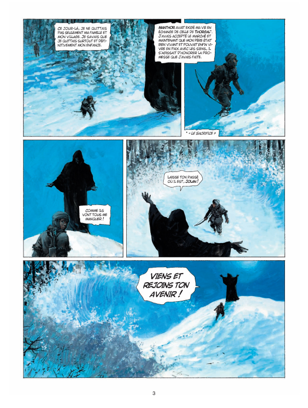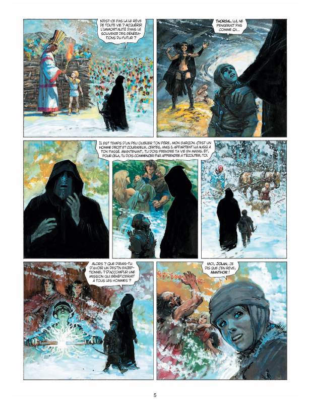 L’événement est d’importance ! Pour ses 30 ans d’aventures, Thorgal s’offre une cure de jouvence avec un album de transition clôturant un premier cycle de la série (qui aura tout de même duré 29 albums !) tout en ouvrant un deuxième cycle qui mettra Jolan sur le devant de la scène. Ainsi, l’Enfant des Etoiles passe la main à son fils tandis qu’au scénario, Jean Van Hamme passe le relais à Yves Sente. D’entrée de jeu, le nouveau scénariste impose sa patte en posant les bases d’une grande série d’aventure, à la fois moderne et dans la continuité du travail de son prédécesseur et modèle. Son Jolan est aussi héroïque qu’il est touchant de jeunesse et une bande de compagnons à la hauteur de ce qu’il s’apprête à vivre lui est par ailleurs adjointe. Ce nouveau souffle est magnifiquement porté par le travail de Grzegorz Rosinski qui retrouve le scénariste de son dernier roman en bande dessinée, «La Vengeance du Comte Skarbek». Une fois de plus, le célèbre artiste a choisi de travailler en peinture directe, dans la lignée de son 29ème «Thorgal», mais en accentuant encore le réalisme de son trait. Une fois de plus, ses cases impressionnent par leur dynamisme et leur nervosité. Préférant toujours le mouvement, Grzegorz Rosinski prouve, album après album, son refus de se laisser enfermer dans un style. Autant de promesses d’une grande série «d’initiation» rythmée et épique. Thorgal peut savourer un peu de repos, son fils est entre de bonnes mains !
