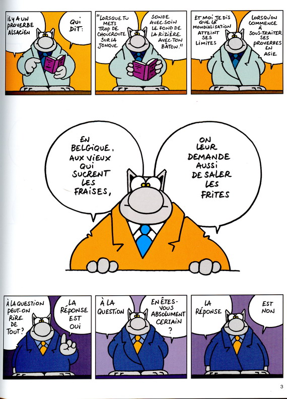 Grâce au talent de Philippe Geluck, LE CHAT (d’abord créé en Belgique en 1983 dans le quotidien Le Soir, puis popularisé initialement en France par le magazine (À Suivre) édité par Casterman) est devenu au fil des années un personnage extraordinairement populaire, connu de tous. Ses aventures, toujours sur format court (illustration, strip ou planche), sont faites d’aphorismes, de gags, de clins d’oeil ou de jeux de mots – autant de facettes de l’inépuisable humour de Philippe Geluck, gagman au long cour et à la notoriété sans cesse grandissante..