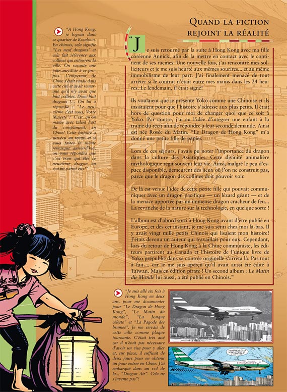 Yoko Tsuno est une héroïne japonaise, férue de technologie, partiellement chinoise par sa grand-mère, et nourrie grâce à elle de l'imaginaire riche et coloré de ce peuple millénaire. Dans ses aventures chinoises, elle va se rendre compte que cet imaginaire peut se fondre avec la réalité et que les dragons des contes pour enfants prennent bien des formes et provoquent des rencontres inespérées qui marquent à jamais.