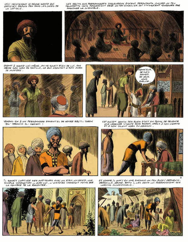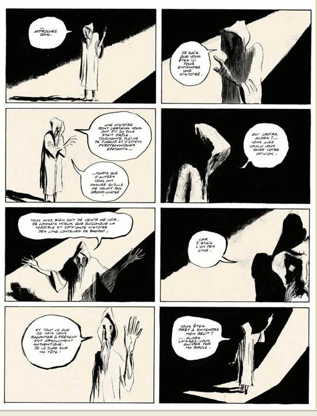 Après un très beau galop d’essai dans « La nuit de l’Inca », le tandem Duchazeau-Vehlmann atteint ici sa pleine maturité. Le graphisme sobre, élégant et elliptique de Duchazeau porte le récit mieux que ne l’aurait fait un réalisme plus fouillé. En feuilletant l’album, difficile d’en imaginer le contenu : le dessin de Duchazeau, propre par sa simplicité à stimuler l’imagination du lecteur, ne dévoile pleinement ses charmes qu’à la lecture. Et le scénario de Vehlmann est une pure merveille. Le conteur aurait pu se contenter de recréer une ambiance Mille-et-une-nuits à l’orientalisme facile, à grands coups de djinns et de génies. Au lieu de quoi il nous entraîne dans une suite bondissante de paraboles aussi ludique que profonde sur l’art du scénario en particulier et de la narration en général. Il y a les Evangiles réécrits dans le désordre. Il y a l’histoire cyclique qu’une tribu d’anthropophage se raconte sans fin de génération en génération. Il y a l’histoire dangereuse qu’il vaut mieux ne jamais raconter. Il y a cette merveilleuse réponse du scénariste « hollywoodien » au narrateurs « artistes » : « Allez vous faire foutre ! Continuez à me mépriser, moi et mon public de merde ! Ces gens qui ont le mauvais goût de ne chercher qu’un peu de rêve et de soleil après une foutue journée de travail ! Mais quand à force de raconter des histoires que nul ne comprend, vous vous retrouverez entre vous, tellement entre vous que vous serez tous seuls, alors revenez m’expliquer comment vous changerez le monde ». Il y a ce passage où Vehlmann exprime probablement son propre dilemme : raconter des histoires subtiles et sublimes qui ne seront comprises que par une minorité, ou donner dans la démonstration de virtuosité pour éblouir les foules ? (N’a-t-il pas choisi d’alterner les deux solutions ?)Bref, « Les cinq conteurs de Bagdad » feront les délices d’un public exigeant. Un public qui, comme dans le cas du « Chat du Rabin » de Sfar, avec une bonne promotion et le bouche-à-oreille, pourrait largement dépasser celui des bédéphiles.
