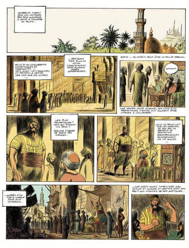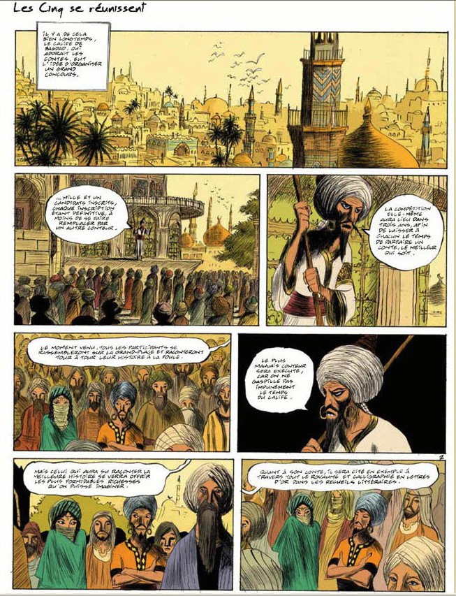 Grand amateur de contes, le calife de Bagdad organise un concours : dans trois ans, mille et un conteurs s'affronteront. Le gagnant connaîtra gloire et richesse, le perdant testera le supplice du pal. Donc, les cinq meilleurs conteurs de Bagdad partent pour un long voyage, histoire de raconter à leur retour, chacun à sa façon, ce qu'ils ont vu : Nazim, Tarek, Wahid (en réalité Wahida, une femme déguisée en homme), Ahmed, (l'enfant du calife) et Anouar, le vieux maître de Tarek – le meilleur conteur, aux histoires un peu trop inquiétantes pour le pékin moyen, qui refuse d'ailleurs de s'inscrire à cette "connerie". Avant de partir, moyennant vingt dinars, nos héros consultent la meilleure devineresse de Bagdad et c'est une très mauvaise idée : vu que la prédiction inclut, entre autres calamités, le meurtre d'Anouar par le gentil Nazim et le mariage de Tarek avec Wahida, ils se mettent en route dans une ambiance plutôt lourde...