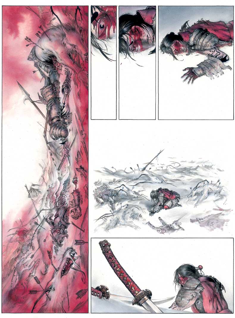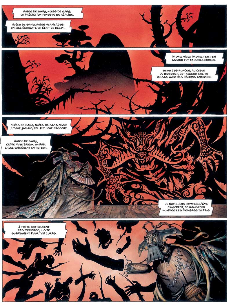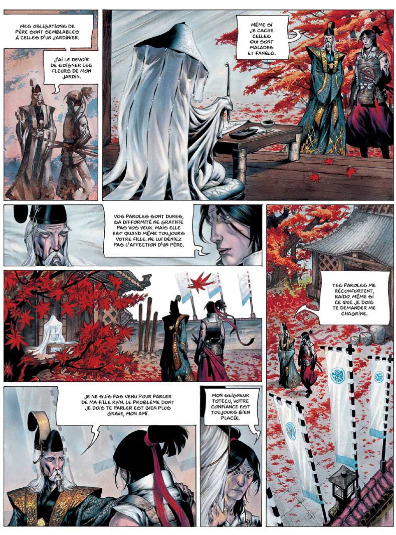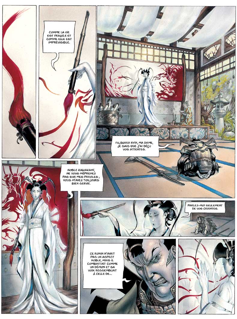 3 Planches. 3 très belles planches. Ces trois premières planches qui placent l'intrigue sont déroutantes à la première lecture car elles sont imprégnées de belle poésie aux vers cruels et sournois - La première de ces planches est d'ailleurs disponible en lien sur cette page. La séance de bunraku (NDLR : théatre japonais composé de marionnettes faites de bois) introduisant le récit impressionne par ses beautés narrative et graphique. Cette introduction mérite à coup sûr à Saverio Tenuta toutes les acclamations. Pour sa première réalisation dans l'univers du neuvième art, on peut dire qu'il frappe fort, et bien !!