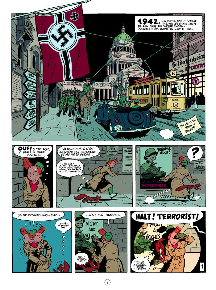 Situé trois ans après le Journal d’un Ingénu d’Emile Bravo, cette histoire se déroule en des temps difficiles et graves. Pourtant, Yann réussit à nous faire partager des moments de pure drôlerie. Les gags et les jeux de mots pleuvent. Personne n’est réellement ce qu’il prétend être. Yann prend un malin plaisir à se moquer des allemands et à les ridiculiser. Les rebondissements se succèdent à un rythme infernal. Les trouvailles scénaristiques s’enchaînent à grand allure. Le scénario est dense, compact et dynamique. Il mérite plusieurs lectures tant Yann y a mis d’allusions et de références. Les dialogues sont savoureux et succulents, teintés de patois bruxellois (il y aura d’ailleurs une version de l'histoire en brusseler). Les clins d’?il aux grands maîtres du 9ème Art parsèment tout l’album. Ainsi, on croise Poildur, un vieil ami de Spirou (du temps de Franquin). Au Marché aux puces, on retrouve Quick et Flupke, Bob Fish, Le jeune Albert, Hergé, Jacobs, Chaland, Lambique, Jérôme et Sidonie. Le Docteur Müller, ennemi de Tintin, torture Poildur. On découvrira plus loin un savant fou bien connu et son robot. Bourvil, De Funès, Gabin font du marché noir comme dans le film La traversée de Paris. D’autres personnages discutent la question de savoir si Hergé est ou non un collaborateur. La polémique va bon train. On savait Yann nostalgique du monde de Spirou. Il le prouve ici. Dans le passé, il a scénarisé le Marsupilami pendant six épisodes (T3 au T9). Il a écrit les textes du second volume de C?urs d’acier dessiné par Yves Chaland. En 2007, il a fait le scénario de l’excellent album Le tombeau des Champignac pour le dessinateur Tarrin. En 2008, il est venu au secours de Morvan et Munuera pour l'épisode «Aux sources du Z». Pourquoi ne fait-on pas appel à lui pour qu’il devienne le scénariste attitré de la série principale des aventures de Spirou ? Mystère... Dans un style proche de celui d’Yves Chaland et de Jijé, Olivier Schwartz fait merveille. Avec un sens inné du découpage, son graphisme superbe à la fois fouillé et limpide lui permet de rendre l’essentiel et les détails les plus infimes exigés par le scénario. La reconstitution historique de l’époque est une réussite tant au point de vue des costumes que de la ville de Bruxelles en 1942.