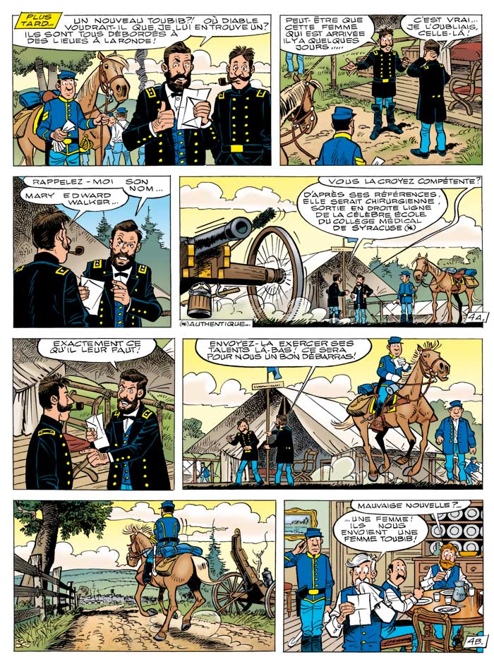 Un nouveau médecin est arrivé au campement des Bleus : le Dr Mary Edward Walker n'est pas du genre à se considérer comme une faible femme et à se laisser marcher sur les pieds par quiconque, gradé ou pas ! Flairant la bonne planque, Blutch s'est empressé de se mettre sur les rangs pour assister le nouveau médecin à l'infirmerie. Mauvais calcul... Mary Edward Walker n'a pas du tout l'intention de le laisser se la couler douce, pour la plus grande joie de Chesterfield. Mais ce à quoi personne ne s'attend, c'est que le franc parler de Mary Edward Walker va réveiller la conscience des soldats sur les dangers réels de la guerre. Une prise de conscience qui ne fait pas vraiment l'affaire de l'Etat-Major...