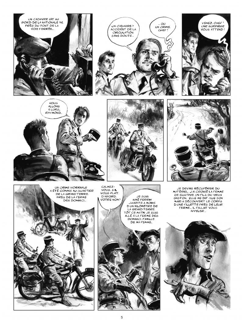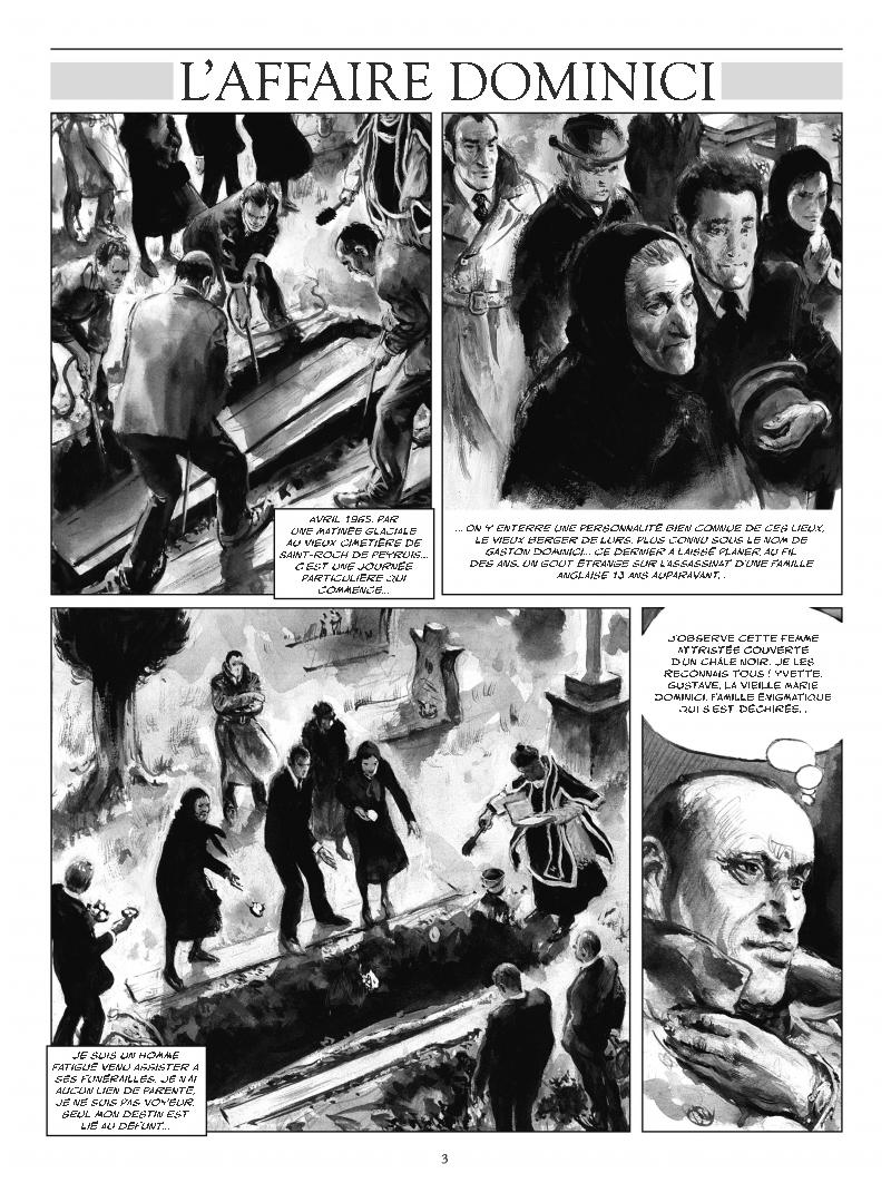 Qui ne connaît pas l’affaire Dominici ? Une affaire judiciaire qui a défrayé la chronique dans les années 50 et a été portée à l’écran plusieurs fois. On se souviendra de l’interprétation extraordinaire de Jean Gabin dans le rôle du patriarche Gaston Dominici. C’est à cette affaire, toujours controversée de nos jours, que s’attaque René Follet et Pascal Besson. On ne présente plus René Follet. C’est un des dessinateurs les plus sous-estimés de la bande dessinée. Son trait est exceptionnel et il excelle, avec sa technique du lavis, pour nous décrire l’histoire. Ce livre est sans couleur, en noir et blanc, tout en ombres et lumières. Cela donne une force supplémentaire au récit. Le lecteur peut ainsi voir par le détail le graphisme de ce maître de la BD. Un cahier de 8 pages d’illustration clôture l’ouvrage et donne un large aperçu du travail de René Follet. On peut juste lui reprocher son académisme mais franchement que c’est beau. Follet qui est avant tout un illustrateur nous fait penser à des journaux comme « Détective » ou aux dessinateurs de Cours d’Assise qui excellent lors de ces procès. Les expressions des personnages sont très bien rendues. Pascal Bresson, dessinateur également, se charge du scénario. Il a bien fallu prendre des options et résumer une affaire fort complexe. Je pense cependant que l’auteur s’est voulu objectif et honnête, qu’il laisse au lecteur la liberté de se faire sa propre opinion. Il réussit la gageure de résumer cette affaire en un seul volume. C’est donc touffu, il faut suivre et ne pas être trop dérangé dans la lecture. C’est le seul bémol que j’ai trouvé à cet ouvrage. Ce livre va probablement relancer la polémique entre les « pro » et les « anti » Dominici. Il suffit de se promener sur certains sites qui s’intéressent à l’affaire pour voir fleurir des avis très tranchés sur cet album. Pour ma part, j’ai bien aimé.