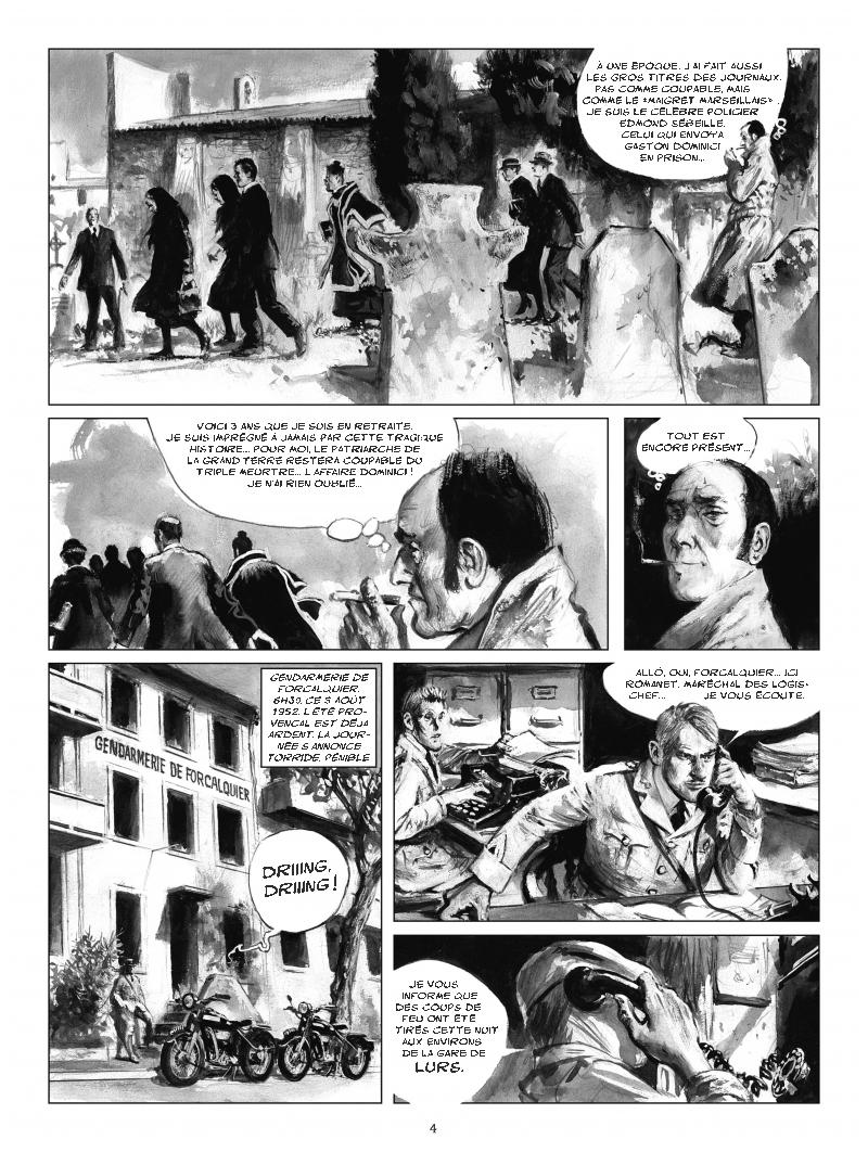 L’été 1952, sur la commune de Lurs en Provence et à proximité de la ferme de la famille Dominici, eut lieu le triple meurtre de la famille Drummond. Une enquête des plus confuses mena à la condamnation à mort du patriarche de la famille, Gaston Dominici. L’affaire passionne et intrigue : les journalistes et le public la suivirent assidûment, Jean Giono et Orson Welles en donnèrent leur vision. Le scénariste Pascal Bresson et le virtuose du lavis René Follet, dessinateur trop rare et pourtant admiré des bédéphiles, se penchent à leur tour sur les faits. Dans ce one-shot à la fois instructif et esthétique, ils donnent leur éclairage sur cette histoire fascinante. Vous retrouverez en fin d’album un magnifique cahier de croquis de huit pages.