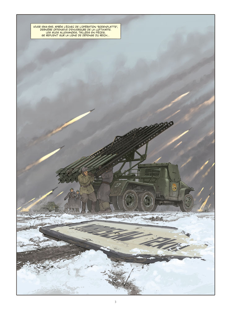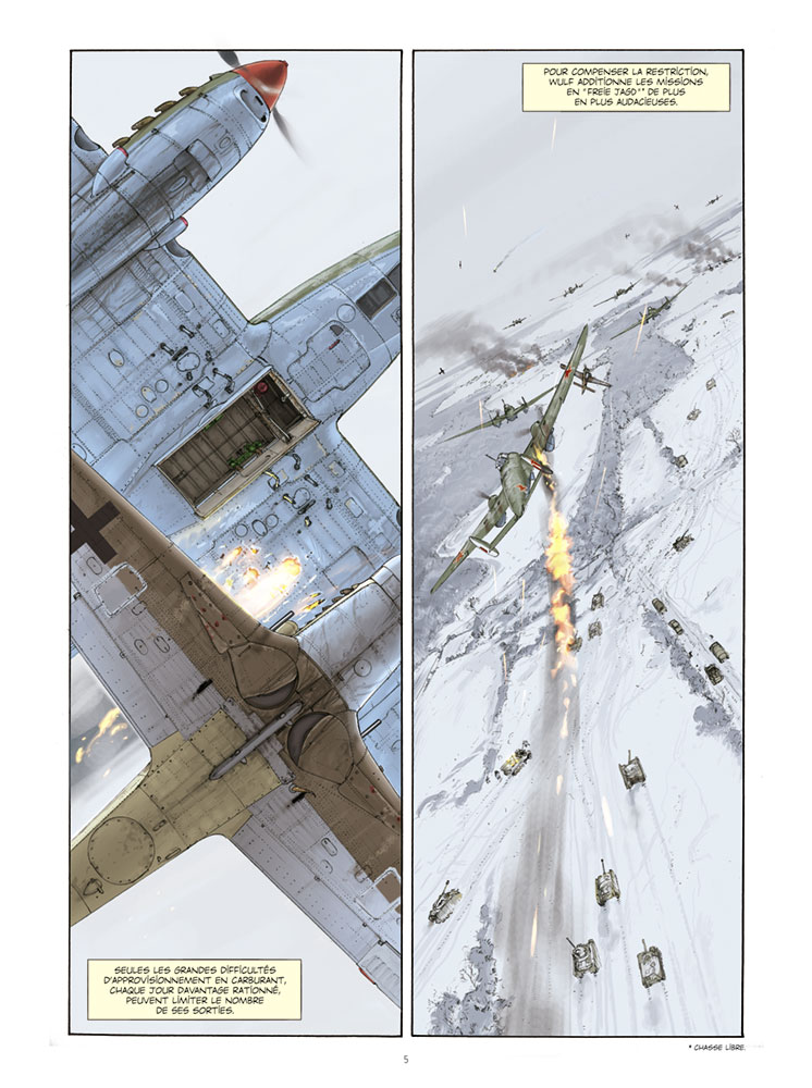 Comment décrire l'admiration que je porte aux auteurs pour le formidable travail de recherche accompli tant historiquement que sur le plan uniformologique et matériel militaire. Camouflage, peintures, armement, véhicules, décorations et drapeaux régimentaires... tout est parfaitement conforme à la réalité. J'en reste pantois car étant ancien collectionneur de militaria WWII, je mesure l'exactitude des planches réalisées. Rien n'est laissé au hasard. Pas une fausse note, tout est rigoureusement exact. Il est à noter que Romain Hugault est pilote confirmé depuis des années et qu'il s'est adjoint les services de Monsieur Herbert Leonard, chanteur à ses moments perdus mais aussi et surtout journaliste aéronautique et expert en aviation militaire Russe de la seconde guerre mondiale ayant écrit quelques ouvrages sur le sujet.