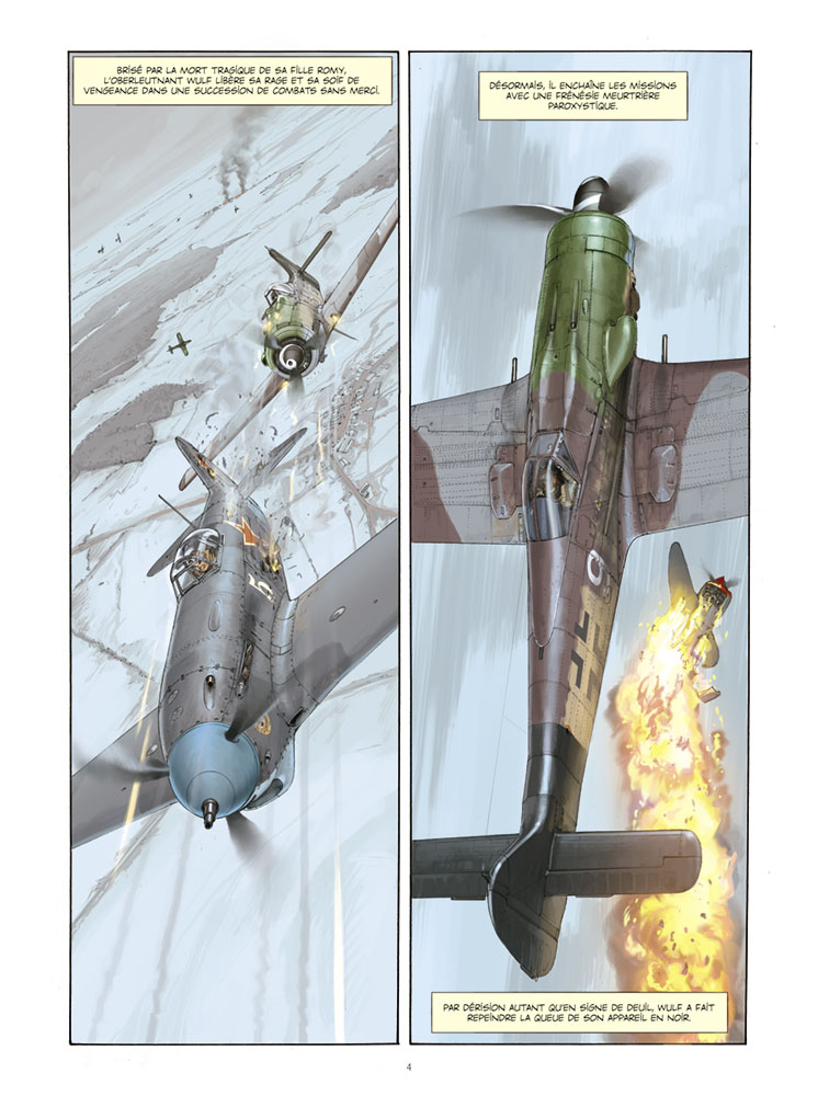 Les dessins sont magnifiques et d' un réalisme inouï (voir la scène du bombardement de Dresde qui vous donne le frisson). Les détails sont tels que nous avons à chaque cases, des renseignements très précis pour les amateurs de modélisme tout autant que pour les collectionneurs de militaria. Un coup de chapeau aussi bien sûr à Yann, scénariste que l'on ne présente plus son travail étant irréprochable aussi, nous gratifiant d'un solide scénario mêlant la grande histoire à celle de nos héros.