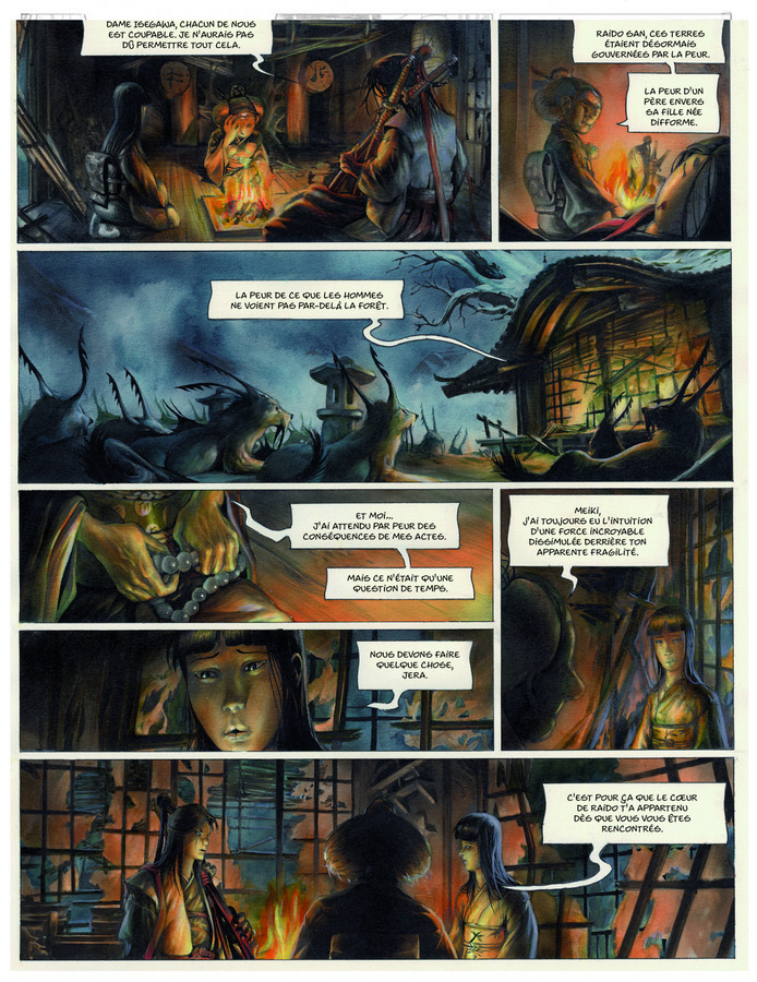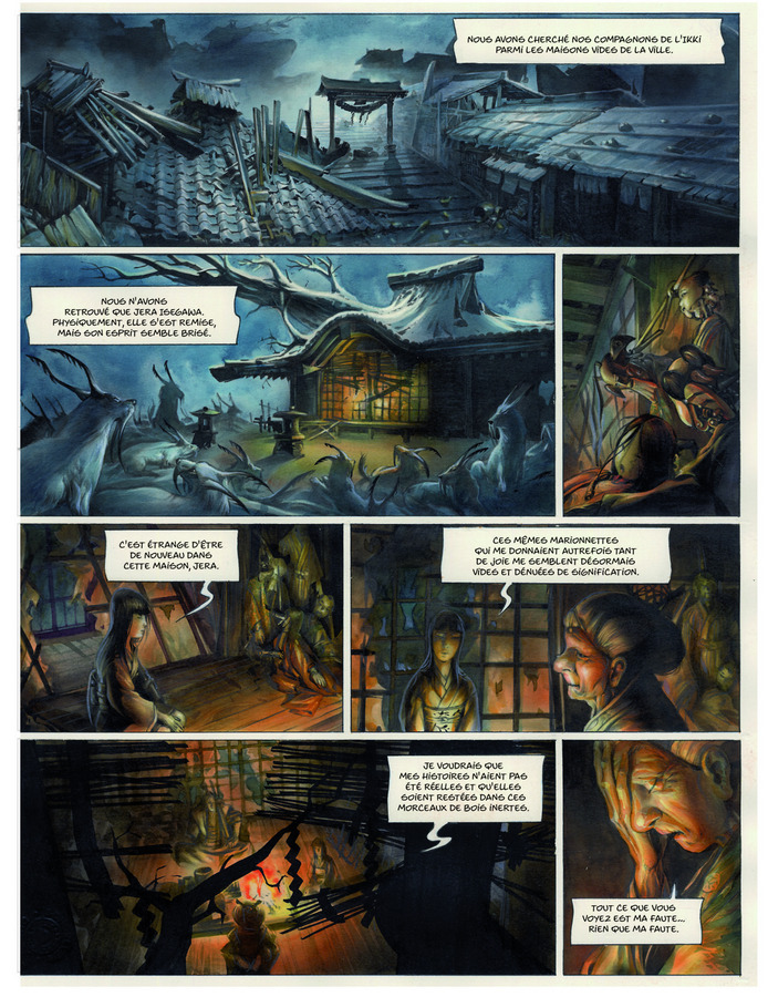 Raido, Ronin ayant perdu la mémoire se voit confier Meiki, jeune marionnettiste. Ces deux-ci ont un destin lié. Raido va recouvrer la mémoire et se rendre compte que tout son passé a été construit sur le sang. Ses deux sabres ont une mémoire: les nuées écarlates. Il va vite se rappeller que son père a été tué dans un village où il découvrira le lien qu'il a avec Meiki et Wunjo, le maitre des loups. Un Conte superbement illustré par Saverio Tenuta, un raffinement extrêmement plaisant. C'est un graphisme très etonnant, une rigueur du traît pointue fait de cet album un ravissement pour les yeux. Cerise du gâteau, apres 3 tomes, l'intrigue est toujours aussi bien orchestrée. Un régal à vous procurer d'urgence !