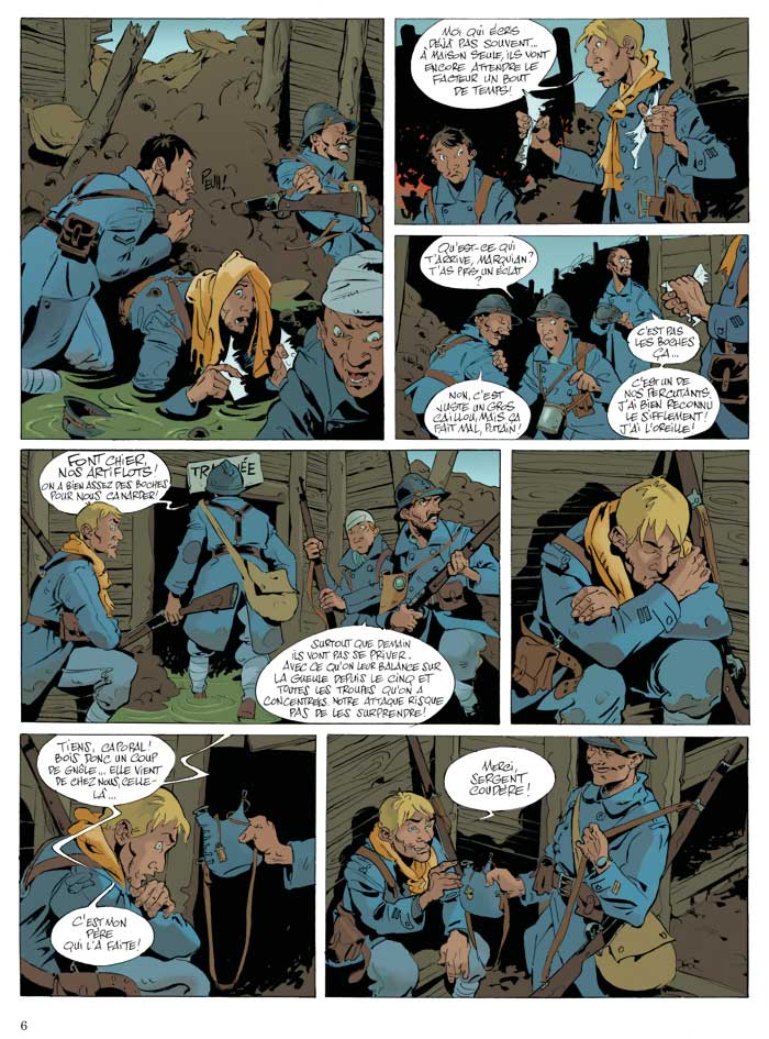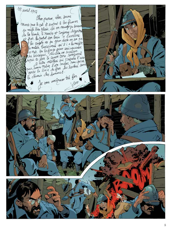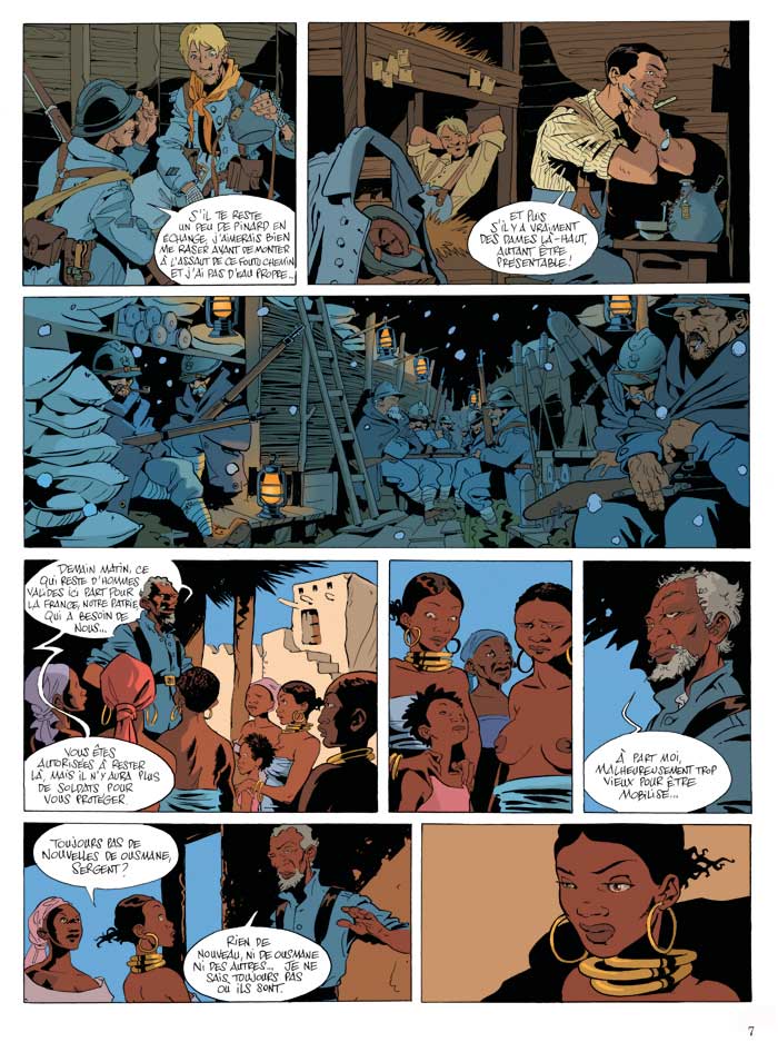 Il aura fallu 4 ans pour que paraisse enfin le second volet de ce dyptique scénarisé par Christian Lax qui en a confié le dessin à un des ses anciens étudiants de l'école Emile Cohl de Lyon, Frédéric Blier. Si la première guerre mondiale est actuellement très à l'honneur en BD et que c'est lors de la fameuse bataille du Chemin des Dames que l'on retrouve Jean et Ousmane, c'est d'une thématique nettement plus large que traite « Amère Patrie ». Qu'est-ce qu'un acte « héroïque » posé en temps de guerre ? Quelles en sont les conséquences au-delà du conflit, la paix revenue ? Sans parler du sort de ces tirailleurs sénégalais défendant leur « mère patrie », la France, dans les tranchées. Derrière cela se profilent les hitoires personnelles, les rancoeurs d'avant-guerre qui trouveront leur écho dans le conflit et après. Le dessin élégant de Blier sert de belle manière une histoire touffue, trop dense peut-être au vu de passages parfois très abrupts d'un chapitre à l'autre. Christian Lax nous avait habitués à prendre plus d'espace pour développer de manière plus progressive certaines scènes porteuses d'émotions. L'univers qu'il campe n'est pas très éloigné de celui de son « Pain d'Alouette » et à nouveau, on sent Lax proche de ses personnages et des valeurs qu'ils représentent. Dommage que ce bel album ne compte pas quelques pages de plus, ou mieux, que cette histoire n'ait pas donné lieu à un tryptique.