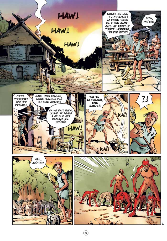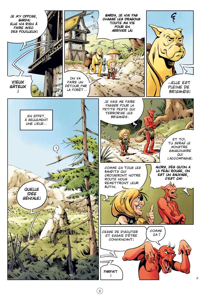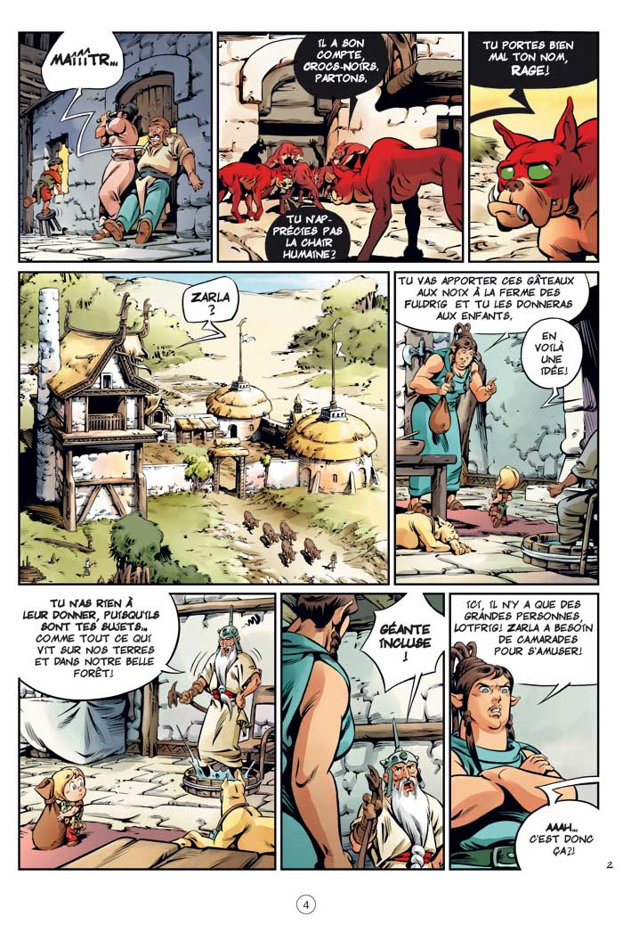 Ouf ! « l'enfant-piège » m'avait paru faire aboutir un peu trop vite les pistes lancées dans les deux premiers albums en accélarant sérieusement le rythme de l'histoire. Ce qui m'avait, je l'avoue, fait craindre un peu quant au devenir de la série. Mais revoici Zarla dans une nouvelle aventure redémarrant sur d'autres bases. Outre un univers d'heroïc-fantasy détournant nombre de clichés du genre, un des atouts de la série est sans conteste la relation unissant la petite fille à son « chien » Hydromel, et c'est une excellente idée qu'ont eu les auteurs d'approfondir cet aspect, ainsi que le passé et la nature même du bull-guerrier. Même si on ne s'ennuie pas une seconde, le cocktail d'humour, de fantasy, et d'action développé dans les trois premiers épisodes fonctionnant toujours à merveille, on a la nette impression de se trouver ici face à une histoire plus « posée », plus aboutie peut-être. La série gagne sans doute en maturité au fil du temps, ou peut-être que la démarrer par une trilogie était un poil trop ambitieux. « Rage », qui peut se lire comme un one-shoot, approfondit et enrichit le monde de Zarla (avec, notamment, l'apparition de nouvelles créatures étonnantes et même de...plagiaires du duo Zarla-Hydromel) alors que le dessin de Guilhem continue, lui, à s'affirmer. Oyez oyez, bonnes gens, la guerrière impitoyable est de retour avec ce qui, pour moi, constitue son meilleur album ! Et si on se trouve dans un tout autre registre que ce qui constitue la majeure partie du catalogue d'un éditeur ensoleillé toulonnais, cette déclinaison d'heroïc fantasy pour enfants sages ne manque vraiment pas de charme. Qu'on se le dise !