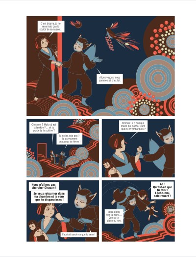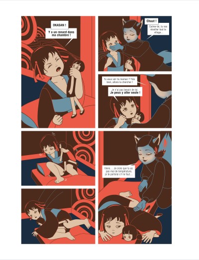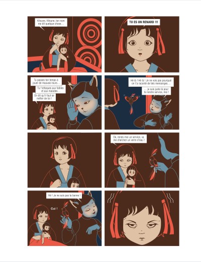 Avec Les Monstres de Mayuko, Marie Caillou signe un très bel album qui nous plonge dans le monde étrange du folklore japonais et de ses esprits malicieux. L’ambiance de cet ouvrage et son graphisme si particulier nous transportent dans un autre univers, où le récit d’un cauchemar peut devenir un conte empreint de délicatesse… Le dessin, parfaitement maîtrisé, est d’une grande sobriété, mais de cette rigueur presque mathématique naît une certaine poésie. Le trait, régulier et très rond, apporte de la douceur ; il est contrebalancé par des couleurs, presque monotones, qui font frissonner, rappelant que c’est un mauvais rêve qui nous est narré. Avec cet album magnifique et déroutant, Marie Caillou revisite l’univers onirique nippon que les films d’animation de Miyazaki ont révélé au grand public.