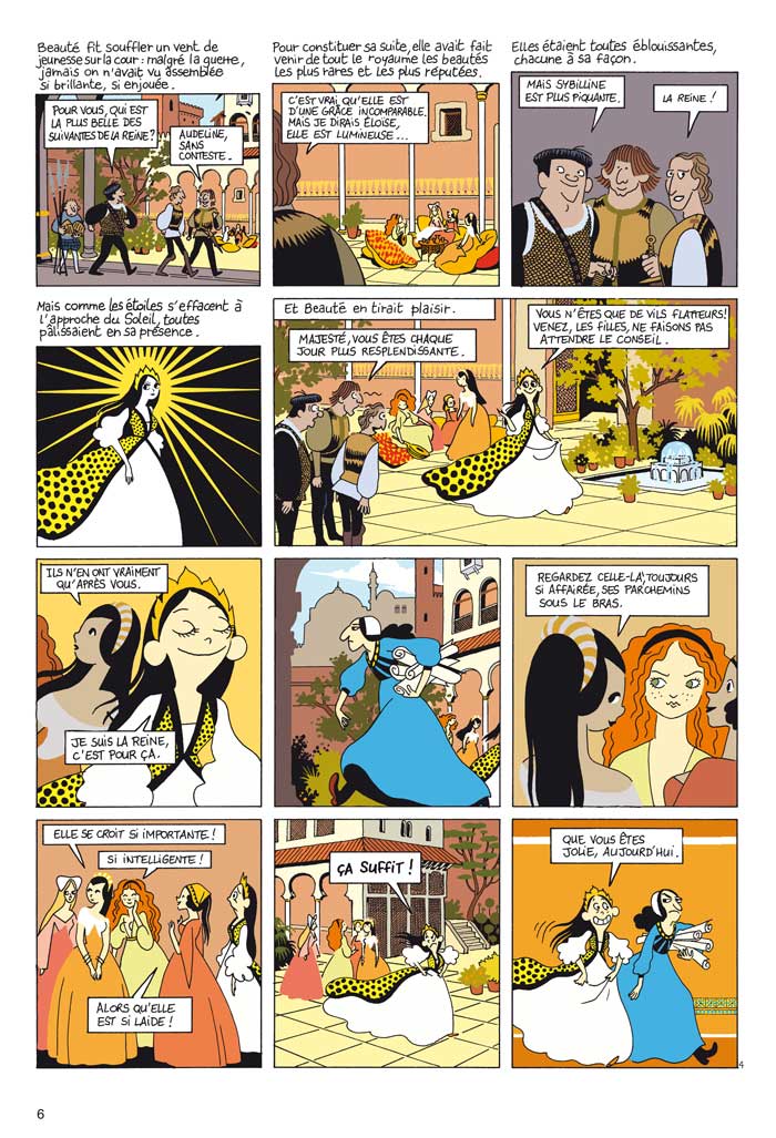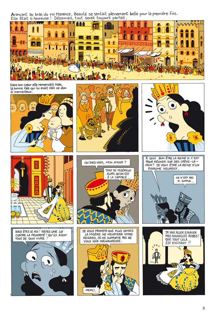 Je n'avais que difficilement accroché au premier volume de ce conte (cruel) écrit par Hubert et dessiné par les Kerascoët. Ses choix graphiques a priori séduisants n'avaient pas suffi à me faire emboîter le pas de cette « héroïne » inspirant au départ la compassion si pas la pitié et devenant peu à peu, grâce (ou à cause) du sortilège de la fée Mab, une beauté, mais capricieuse, tyrannique...et finalement insupportable. A l'issue de ce tome 2, le moins que l'on puisse dire est que les choses se sont encore considérablement assombries, au point d'inspirer à Beauté certains regrets quant à sa vie passée et à son identité de Morue. En effet, dans ce second album, les événements se précipitent, et si l'attitude de cette « Reine indécise » a toujours de quoi horripiler, ce sont les conséquences de son comportement sur son entourage qui prennent des dimensions catastrophiques... Le scénario ne ménage pas les rebondissements (dont certains de taille... mais on ne vous les dévoilera pas) et on pourra apprécier la satyre des jeux politiques au sein d'un royaume qui devient peu à peu ingouvernable...(tiens, tiens, il me semble déjà avoir entendu parler de quelque chose qui ressemblait un peu à ça...). Les auteurs, en tous cas, jouent de toutes les manières (on a parfois l'impression de se trouver à une version destroyet noire du « Royaume » de B. Feroumont) de cette situation. On en vient finalement à s'attacher à la princesse Claudine, laide mais pleine de bon sens si pas de sagesse face à cette avalanche d'événements négatifs qui s'abat sur les terres du roi Maxence. Et vu les pistes lancées et la manière dont se déploie ce second volet, on peut déjà présager d'un final... inattendu. Quelle sera la morale de ce conte s'il y en a une? La différence entre apparence et réalité semble évidente mais bien trop simple par rapport au développement de l'histoire. Graphiquement, ce tome 2 prolonge un style étonnant, évoquant tantôt les enluminures, tantôt un trait que l'on pourrait rapprocher de tel ou tel folklore. Malheureusement, la surprise ne jouant peut-être plus, j'ai l'impression que d'une certaine manière ce second album perd côté dessin ce qu'il gagne en scénario. Sans doute faudra-t'il attendre la conlusion du tome 3 pour pouvoir apprécier cette série atypique à sa juste valeur