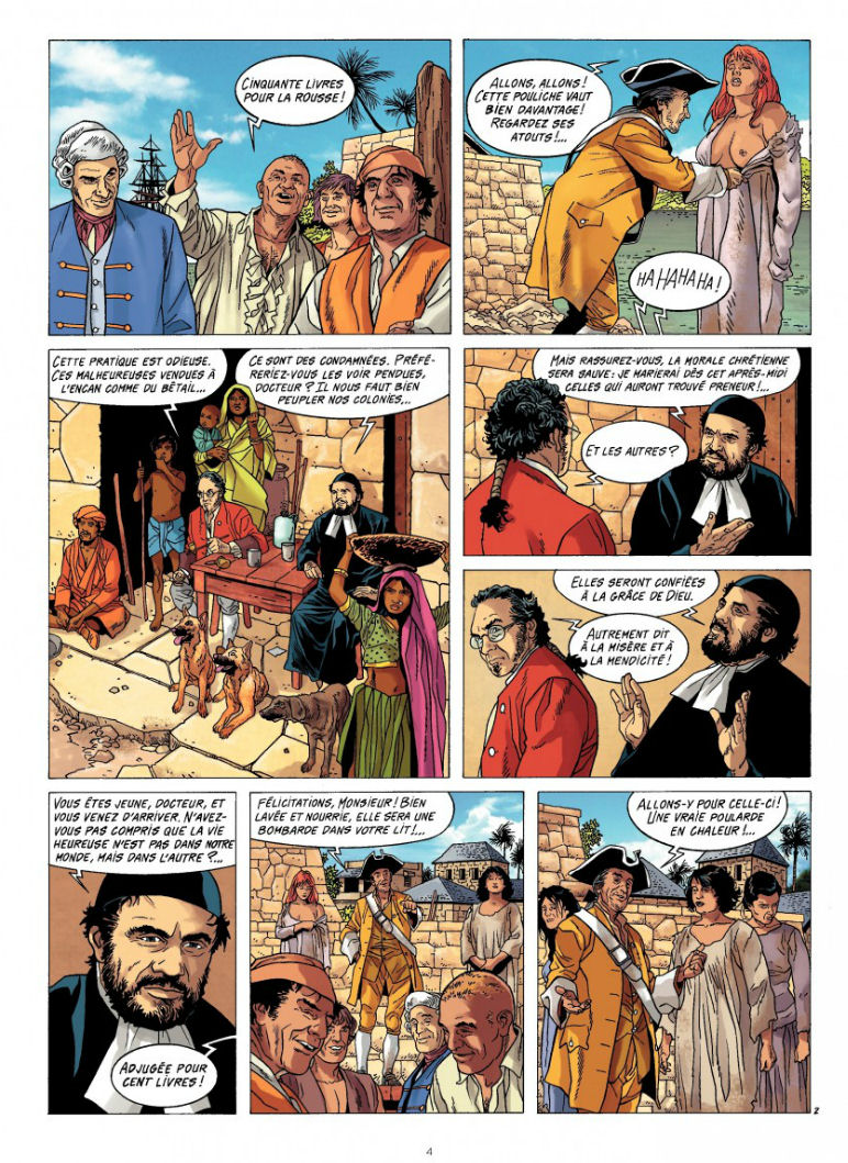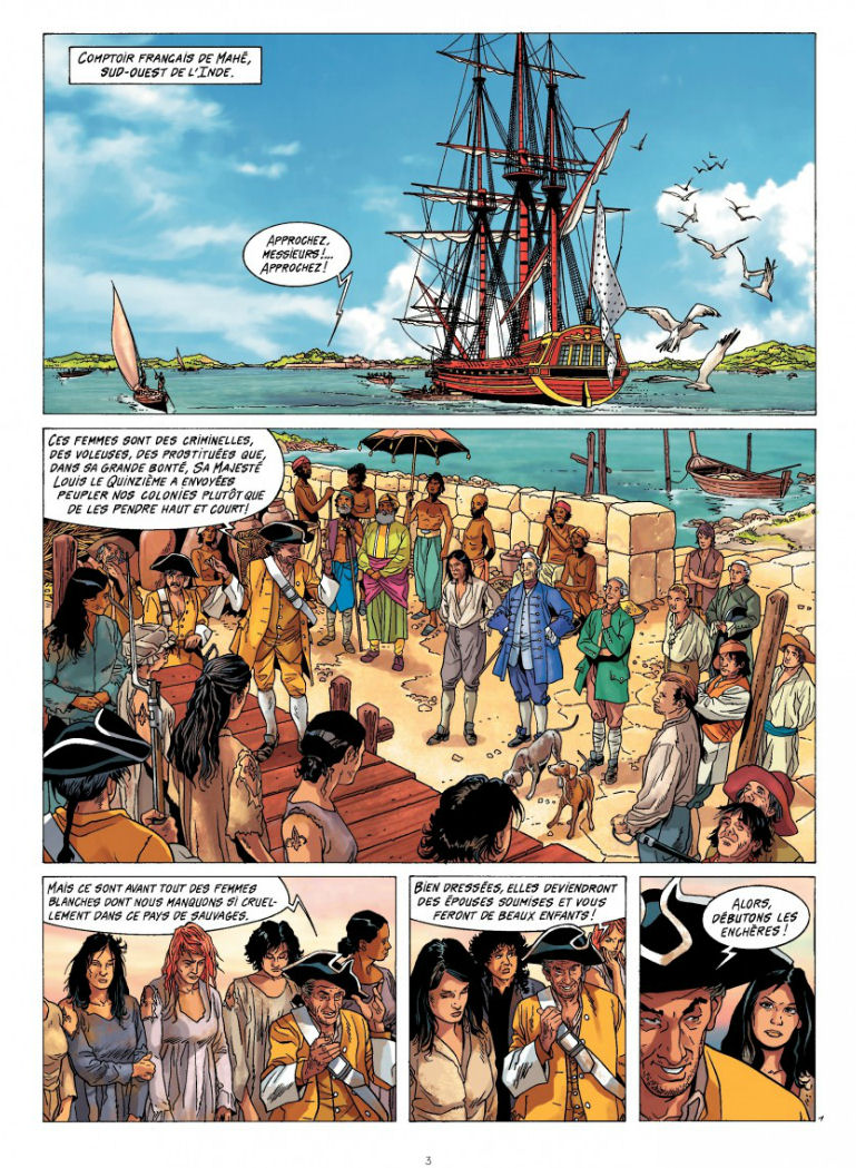 Dès le départ, les auteurs ont affiché avec Rani (en série télé et en BD) la volonté de réaliser une grande fresque romanesque, « à l'ancienne » aurait-on envie d'ajouter, tant les rebondissements rythmant les trois premiers chapitres (la série est prévue en 8 albums) peuvent évoquer nombre de films d'aventure ou de « cape et d'épée » d'un certain âge d'or du cinéma français. Difficile aussi de ne pas penser à une certaine Angélique. Mais quoi qu'il en soit, force est de contater que la sauce prend plutôt bien avec ce tome 3 qui nous emmène aux Indes où celle qui deviendra Rani se retrouve esclave, achetée par madame Rose, tenancière de la maison de plaisirs de la compagnie des Indes au comptoir français de Mahé...avant de reprendre elle-même les rênes de cette euh...institution. Très classique, le scénario d'Alcante, adapté de celui de Van Hamme pour la TV, se déroule sans heurts, ménageant suffisamment d'action et de suspense pour conserver le rythme de la série, et nous réservant aussi quelques petits traits d'humour. Le dessin - très classique aussi- de Vallès lui répond bien, dévoilant cette fois un univers forcément très féminin et nous gratifiant de l'une ou l'autre discrète touche d'érotisme très soft. Chapeau aussi pour le travail sur certains costumes et sur des décors particulièrement soignés. En outre, le déplacement de l'action sous des cieux exotiques offre au coloriste Christian Favrelle l'occasion d'élargir sa palette et le résultat est, de ce côté, éblouissant. Notons que le résumé des épisodes précédents, en début d'album, est le bienvenu, notamment quant aux changements d'identité de l'héroïne. Des changements qui jouent des tours aux auteurs, comme on s'en rend compte dans un phylactère lors d'une conversation entre l'héroïne et Françoise... Un album très...classique (ben oui...) mais un bon moment de lecture et d'évasion, ce qui n'est quand même pas mal pour un bouquin intitulé « Esclave » !