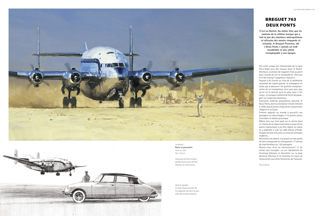 J'ai rencontré Lucio Perinotto pour la première fois il y a 15 ans. Tombé par hasard sur ses toiles lors d'une exposition dans le hall d'un aéroport parisien, je m'étais mis en quête de retrouver l'artiste avec la ferme intention de devenir l'heureux propriétaire de l'une d'entre elles. Tombé par hasard, mais sous le charme, de ces huiles en noir et blanc, Super Constellation, DC3, DC4, Boeing 314 Clipper, Dewoitine-338, fendant le ciel de Manhattan ou se préparant aux longs voyages au dessus de l'Atlantique Nord dans les ambiances pluvieuses et animées du Bourget de l'après-guerre, de la Guardia, de Londres ou d'Amsterdam-Schiphol. Un style simple, efficace, combiné à un incroyable traitement des jeux de lumière donne aux oeuvres de Lucio Perinotto, une vitalité exceptionnelle. (...) Les toiles de Lucio Perinotto ne sont pas silencieuses, vous entendez le vrombissement des moteurs, vous partagez la magie du vol, la concentration des pilotes. Il se dégage des oeuvres de Lucio Perinotto un climat particulier, empreint d'une certaine nostalgie à une époque où voyager en avion était un luxe rare réservé à une certaine élite. Pour faire court, Lucio Perinotto est un artiste unique. (...) Il y a deux ans les éditions Paquet nous avaient offert dans un magnifique "Artbook", les plus belles illustrations de Lucio Perinotto réalisées pour les couvertures du Fana de l'Aviation, l'autre facette de l'artiste. Pour notre plus grand bonheur, Paquet récidive, avec cette fois, quelques-unes des plus belles huiles du peintre.
