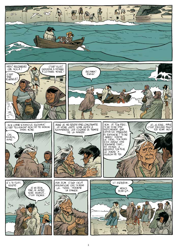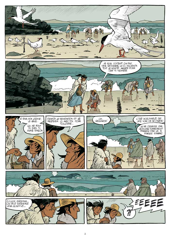 Voici donc le premier tome d'Esteban réédité sous l'étiquette Dupuis et complété d'une introduction inédite. Certains parleraient d'un tome de présentation, or on va bien plus loin que ça dès le début de cette grande aventure au dépaysement assuré. En effet, c'est quasi dans un autre monde que nous invite Matthieu Bonhomme. On connaît généralement bien peu de choses quant à cette région de la Terre de Feu, à l'extrême sud du continent sud-américain, ainsi que de la chasse à la baleine à l'aube du 20ème siècle. On apprend donc beaucoup, en sentant que l'auteur s'est appuyé sur une sérieuse documentation, tout en ne s'ennuyant pas une seule seconde. Esteban est diablement attachant et apporte à sa manière, un peu d'innocence et de poésie parmi la belle galerie de « trognes » patibulaires du Leviathan. On s'interroge aussi sur les liens qui l'unissent au capitaine, aussi excessif qu'énigmatique. Graphiquement, outre la création d' un beau héros, Matthieu Bonhomme excelle à reconstituer le port des baleiniers comme les scènes maritimes, dans son style de dessin immédiatement reconnaissable conservant une grande part de crayonné dans les textures, les ombrés, les plis des vêtements conjuguée à un encrage plus classique. Les planches inédites de l'introduction sont parfaitement « raccord » comme l'on dit dans le cinéma, avec la suite de l''album, et pour rester dans le domaine du grand écran, c'est vraiment à une aventure à grand spectacle que l'on a droit. Pourtant, paradoxalement, on a aussi l'impression -renforcée par l'utilisation d'une palette de couleurs volontairement limitée- que le dessinateur économise ses moyens. Mais s'il le fait, c'est pour privilégier le trait juste, l'efficacité et la lisibilité. Ce premier album peut se lire comme un one-shot, et est, de plus, mais pour un délai limité, accessible à des conditions particulièrement avantageuses en librairie. Difficile de ne pas être harponné !