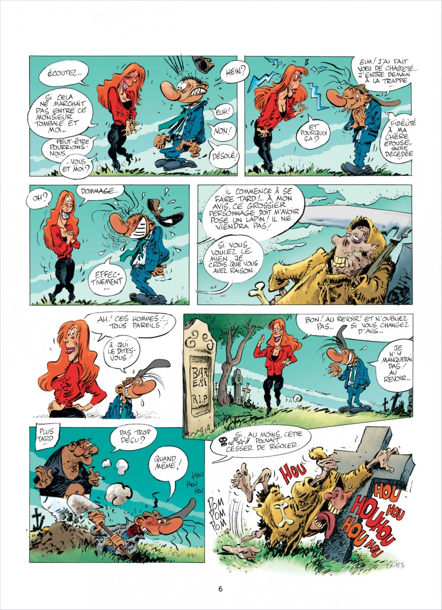 30 ans déjà, dans le langage judiciaire cela correspond à perpétuité (rien à voir avec la concession à perpétuité) ! Qui aurait osé parier en 1983 sur le succès d’une série humoristique basée sur la mort et sur le gardien du jardin des âmes ? Trente années plus tard, j’attends toujours avec autant d’impatience (et je ne suis pas le seul) les aventures de Pierre Tombal scénarisée par Cauvin et couchée en images par Hardy. Sur ces trente années, la mort a frappé un certain nombre de lecteurs mais la vie a fait son œuvre afin d’en amener d’autres ! Le commerce autour de la mort a lui aussi fortement changé au grand dam de notre ami Pierre lequel étant de plus en plus confronté aux défunts préférant la crémation à l’inhumation ! 29 tomes et toujours de nouveaux gags inattendus ! Un de mes souhaits avant le grand voyage est de pouvoir encore lire de nombreuses aventures de notre fossoyeur favori ! A se procurer sans tarder dans toutes les bonnes entreprises funéraires librairies !NDLR : N’oublier pas l’expo des planches de Marc Hardy que vous pouvez admirer du 4 avril au 12 mai 2013 au Centre Belge de la Bande Dessinée 20, Rue des Sables à 1000 Bruxelles (Ouvert tous les jours (sauf lundi) de 10 à 18 heures) Tel. +32 (0)2 219 19 80 Ni fleurs, ni couronnes mais une bonne dose d’humour !