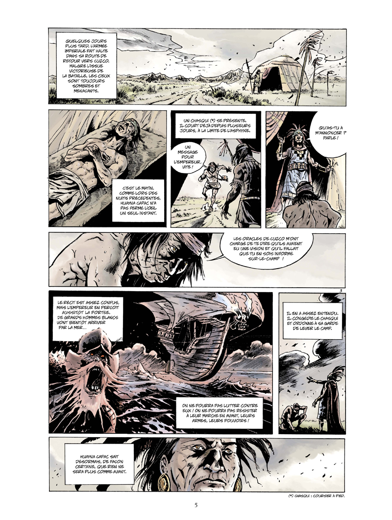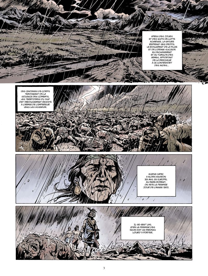 Si vous appréciez la civilisation Inca, cet album est fait pour vous. Lionel Marty relève le défi d’illustrer magistralement un scénario signé Granier & Bollée. Le seul reproche que je peux faire se situe au niveau du scénario qui ressemble au découpage d’un long métrage, beaucoup trop rapide pour une BD et mettant le lecteur en porte à faux vis-à-vis des personnages et des différentes époques abordées. Un premier tome qui plante le décor en attente du prochain volume des aventures d’Amaru.