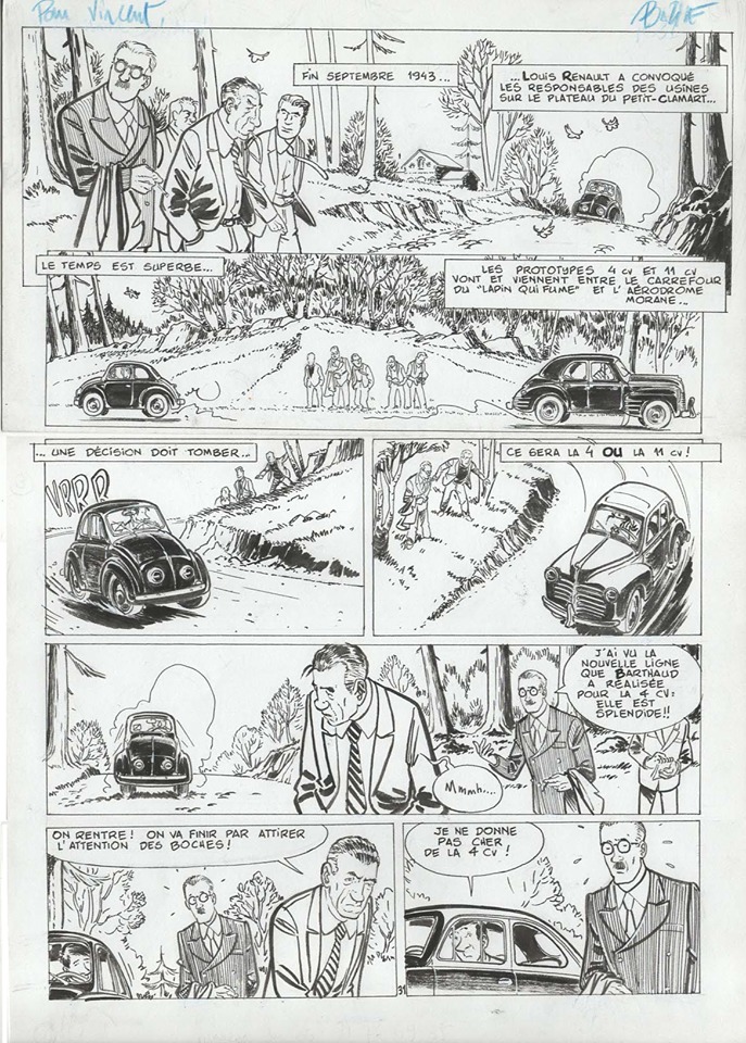 Ce livre nous plonge dans la chronologie des usines Renault lors du second conflit mondial en nous invitant à découvrir l’histoire de la création à la réalisation de la 4CV Renault, la première voiture française vendue à plus d’un million d’exemplaires ! Née dans l’esprit de quatre hommes dont deux ingénieurs français après la vision de la KDF Wagen, plus connue sous le nom de« Coccinelle», lors du Salon automobile de Berlin en 1939, Ferdinand Picard et Charles-Edmond Serre vont mettre tout en œuvre afin de développer une petite voiture accessible à un large public à la fin de la Seconde Guerre mondiale. Face aux nombreux obstacles rencontrés (interdiction de développer de nouveaux projets pendant l’occupation, bombardements des usines Renault, scepticisme de Louis Renault vis-à-vis du projet, pénurie de matières premières, nationalisation de la société en sortie de guerre), ils redoubleront d’ingéniosité afin de présenter une première version de leur création au Salon automobile de Paris en 1946. Scénarisé par Dugomier, mis en images avec le talent graphique de Bruno Bazile, nos deux compères nous transmettent une bande dessinée accessible à l’ensemble des lecteurs à partir de 10 ans. En attente avec impatience des histoires de la 2CV Citroën et de la non moins populaire « voiture du peuple » Coccinelle Volkswagen.