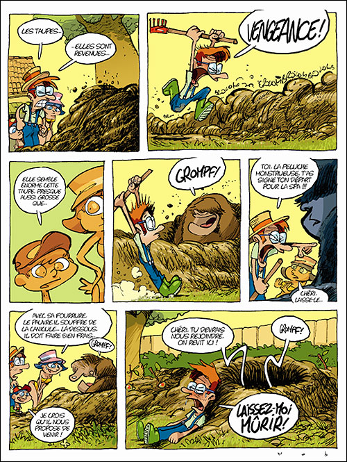 Voici le retour de Grompf dans un tome 3 toujours aussi cocasse et locasse. A un rhythme de sorties d'environ tout les 4 mois, l'auteur sait néanmois garder tout l'efficacité de son trait et nous faire passer un agréable moment de détente et d'humour. Le yéti fait toujours autant de bêtises et cette fois, l'apparition d'un petit chat en début d'album, qui sous ses airs candides cache une véritable petite peste, vous mettera en apetit pour la lecture des gags suivants ou un proffesseur de gym, véritable genre de tyran sorti des marines, enmenera Le yéti et son petit protégé dans une promenade bucolique en forêt (ouille). Il y a également au programme de la devastation de potager, des burp et autres onomatopées gastriques diverses ou encore, des aventures à la plage qui ne manqueront pas de vous dilater les zygomatiques. Les thèmes ne manquent pas et Grompf reste très attachant. Bref, une BD au poil :)